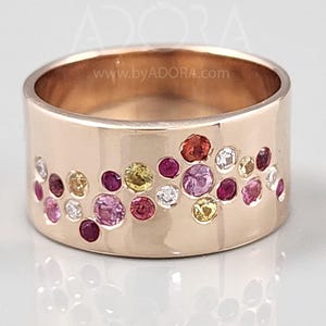 Handmade solid 14k rose gold cluster ring set with rainbow sapphire blue green yellow and red.