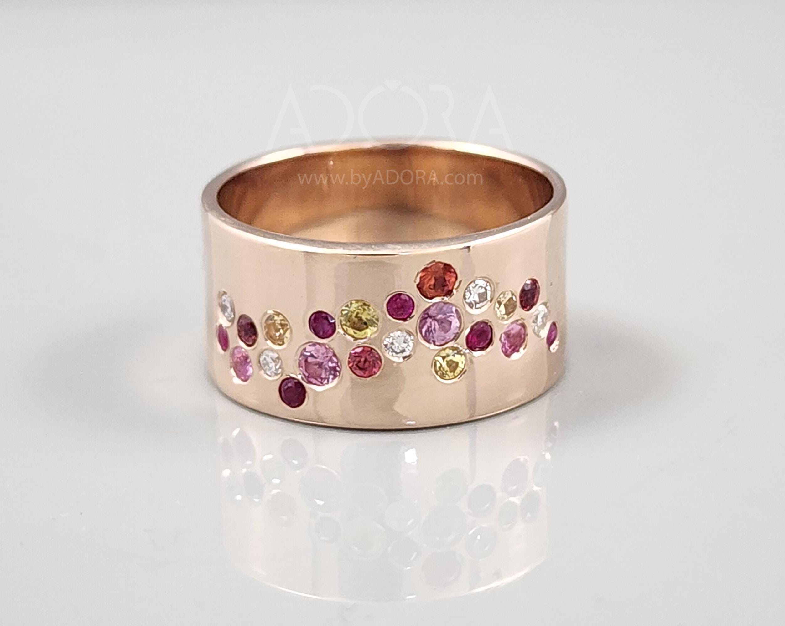 ✧ I will set 23 brilliant cut gems in the ring. 4 Pink Sapphire, 4 Yellow Sapphire,4 Orange Sapphire, 6 Rubies and 5 Diamonds.