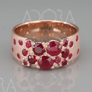 Handmade 14k Champagne Gold Multi Stone Ruby Cocktail Ring | Natural Ruby Cluster Evening Ring | Wide Dress Ring