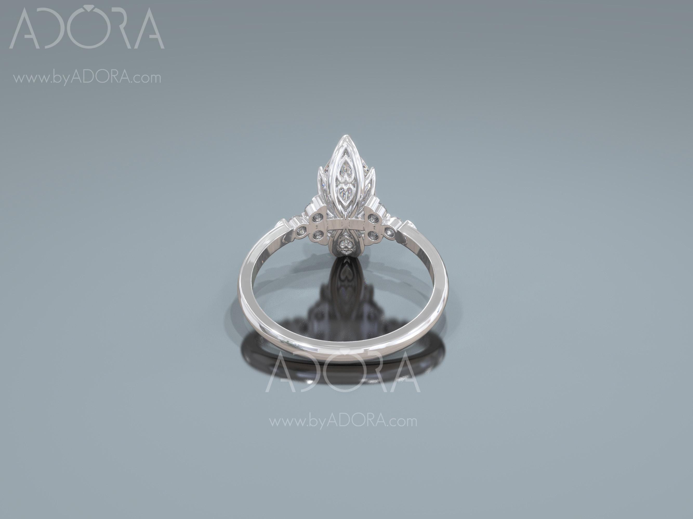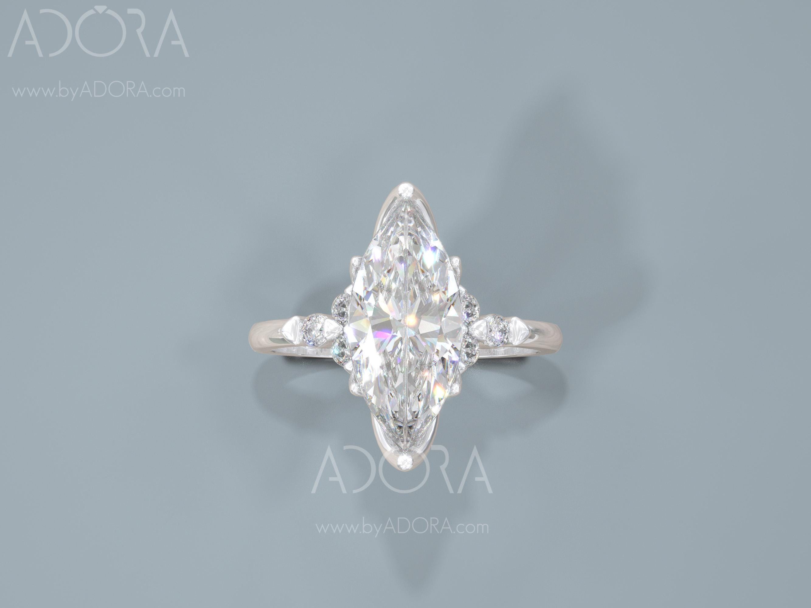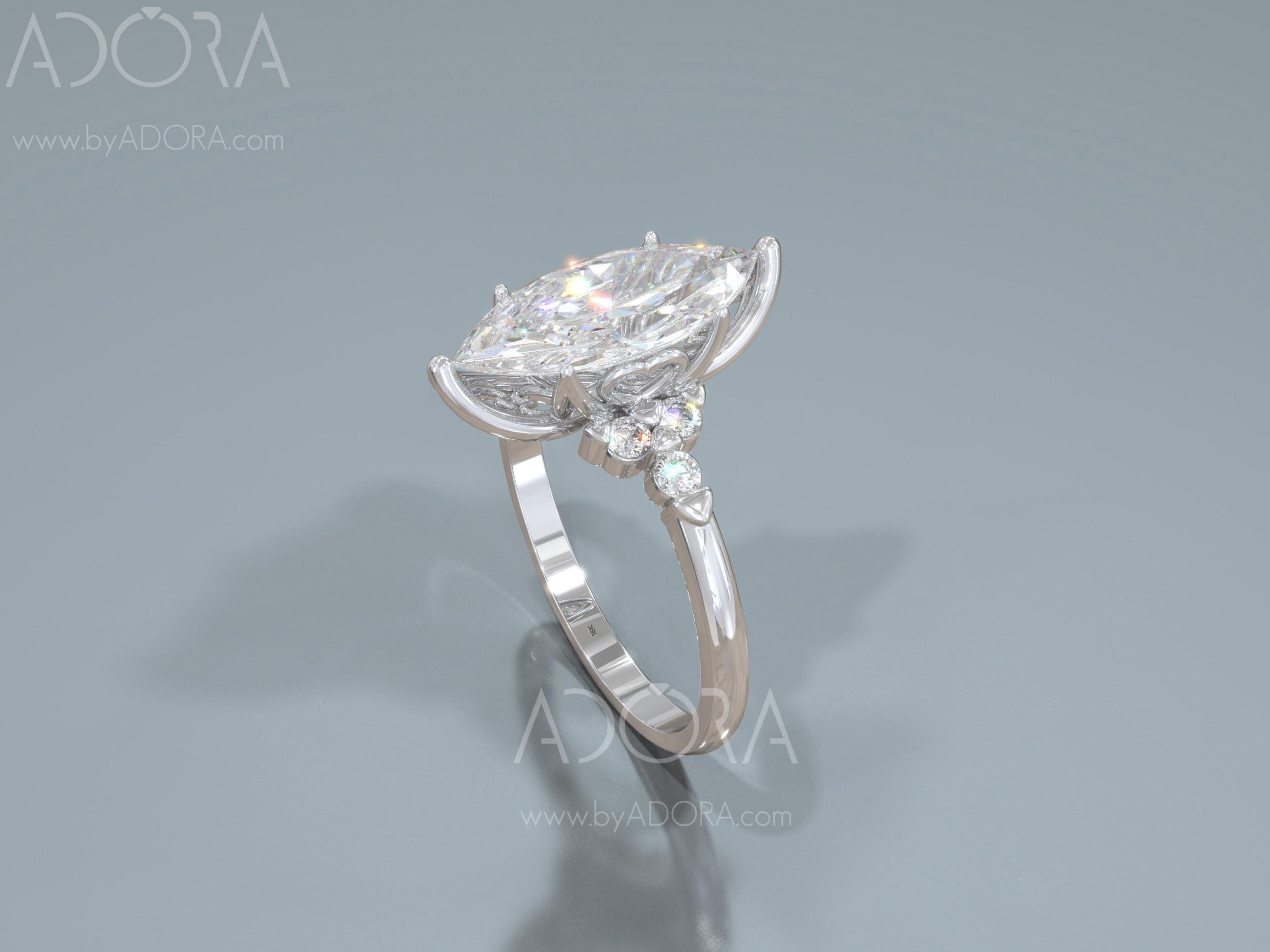 An elegant and remarkable Marquise cut ring set with a lab grown diamond center stone and brilliant accent diamonds. The bezel was design as a flower petals to let more light intensify the natural beauty of the diamond, creating a ring no one can ignore. If you are looking for something exceptional, this ring is for you!