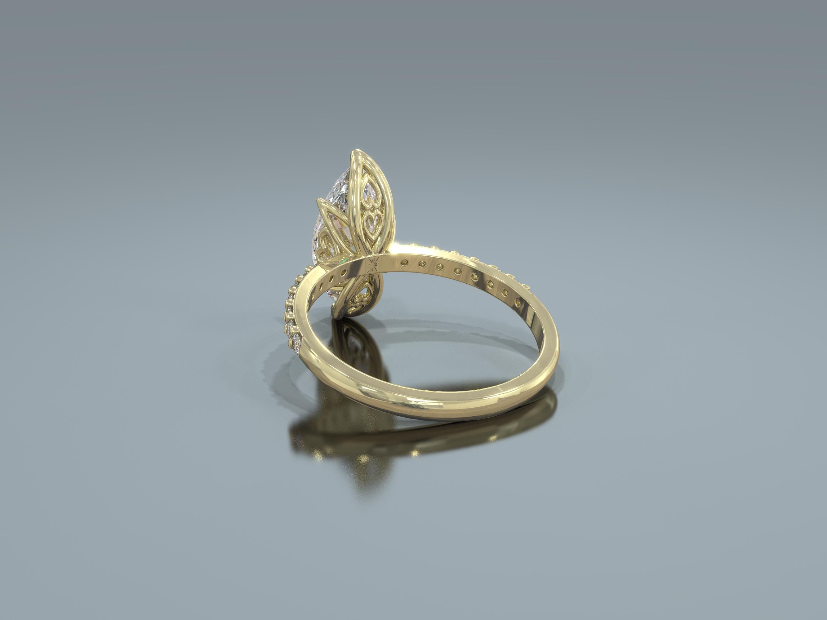 An elegant and romantic Marquise cut ring set with a lab grown diamond center stone and brilliant accent diamonds. The bezel was design as a flower petals to let more light intensify the natural beauty of the diamond, creating a ring no one can ignore. If you are looking for something exceptional, this ring is for you!