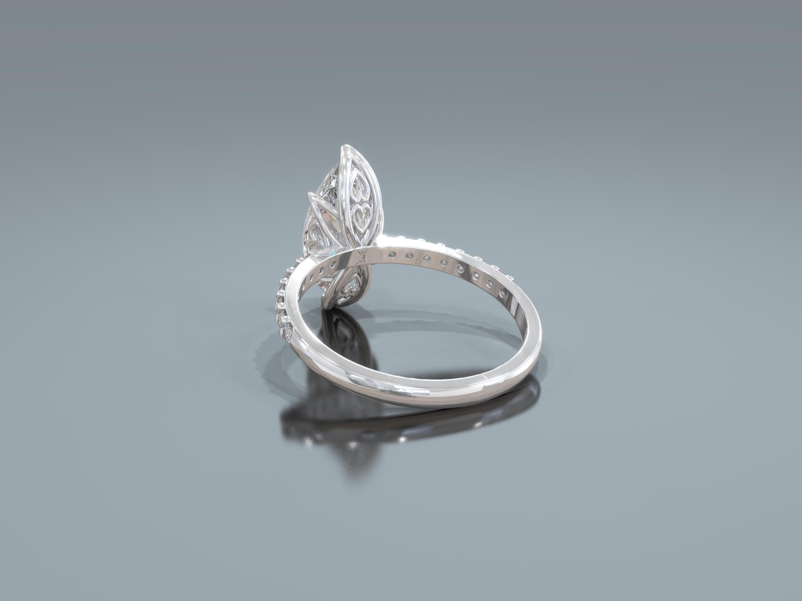 An elegant and romantic Marquise cut ring set with a lab grown diamond center stone and brilliant accent diamonds. The bezel was design as a flower petals to let more light intensify the natural beauty of the diamond, creating a ring no one can ignore. If you are looking for something exceptional, this ring is for you!