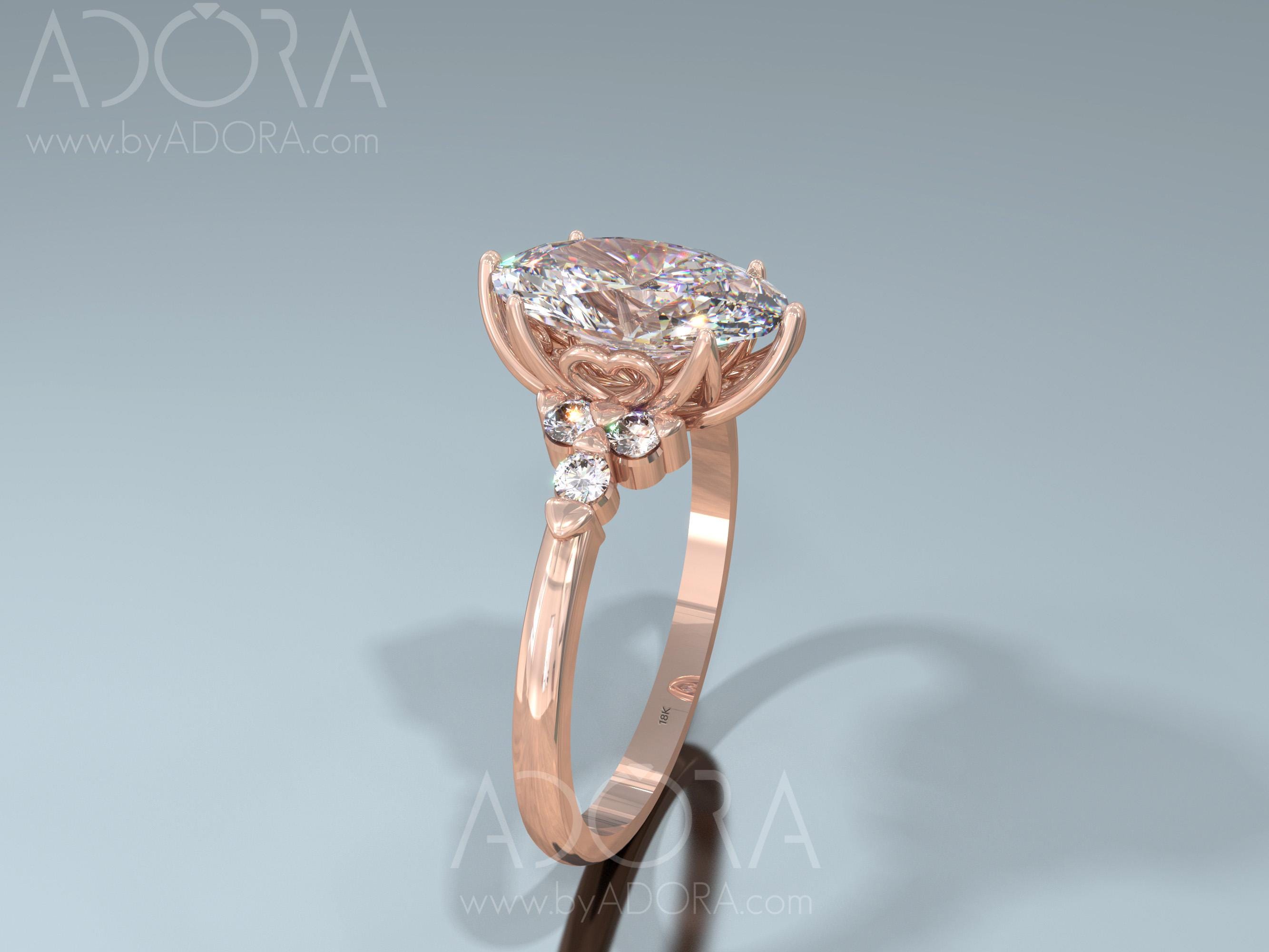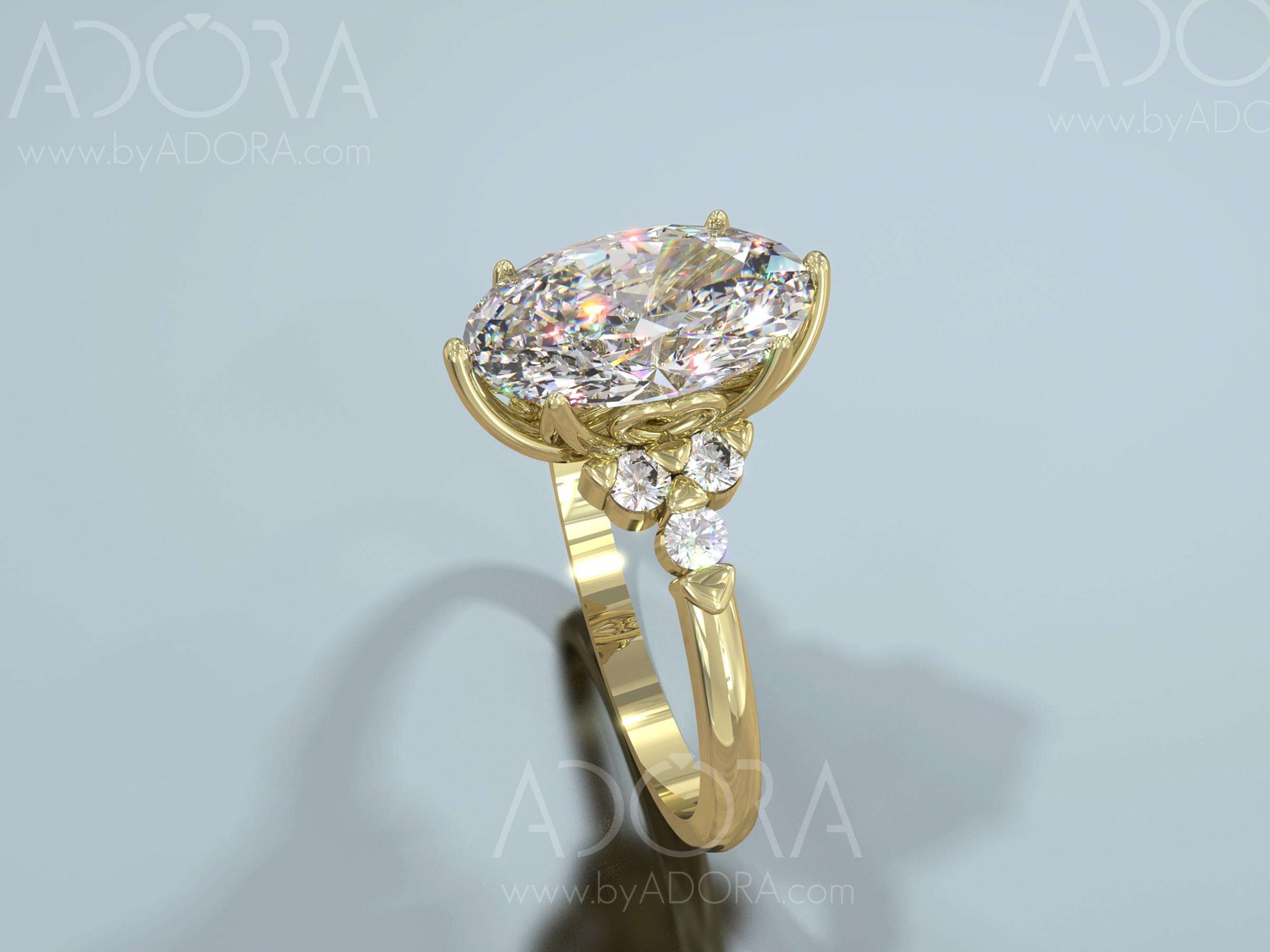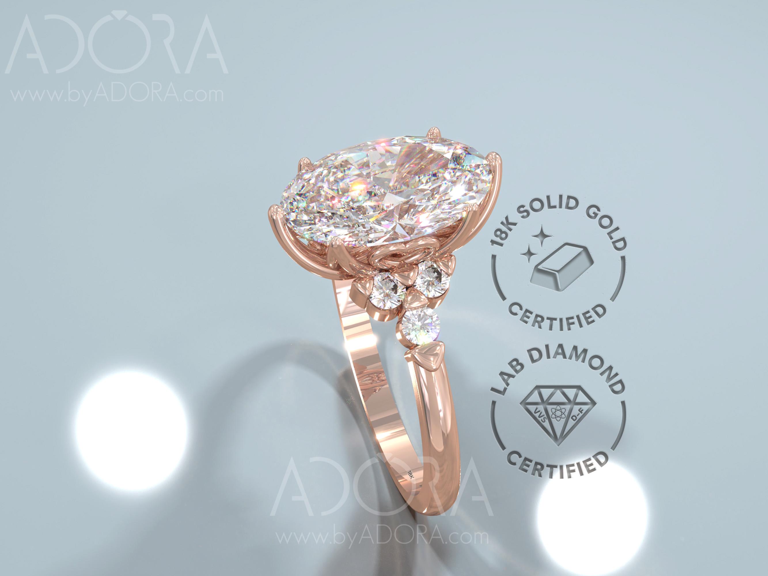 An elegant and remarkable Oval cut ring set with a lab grown diamond center stone and brilliant accent diamonds. The bezel was design as a flower petals to let more light intensify the natural beauty of the diamond, creating a ring no one can ignore. If you are looking for something exceptional, this ring is for you!