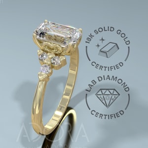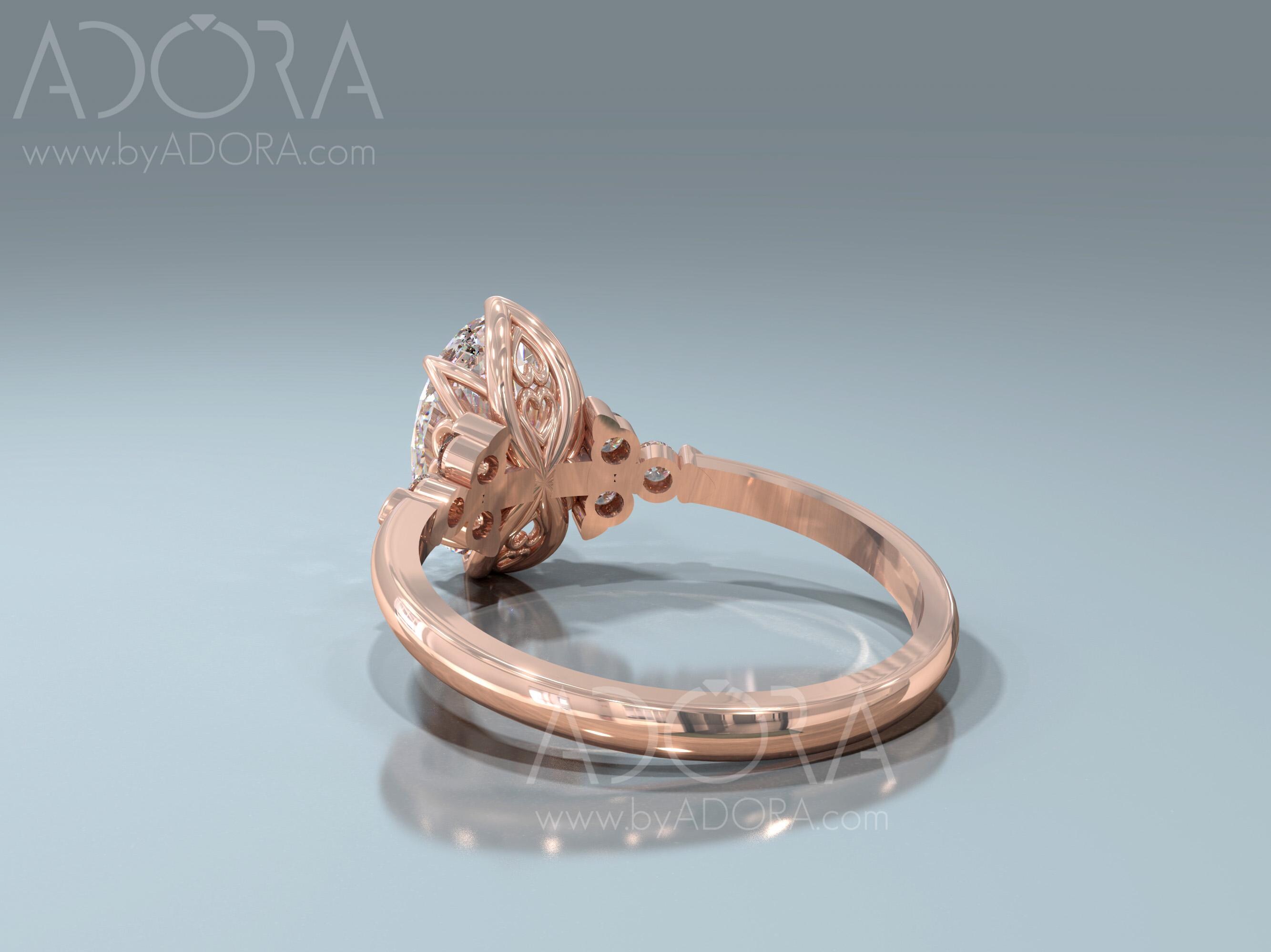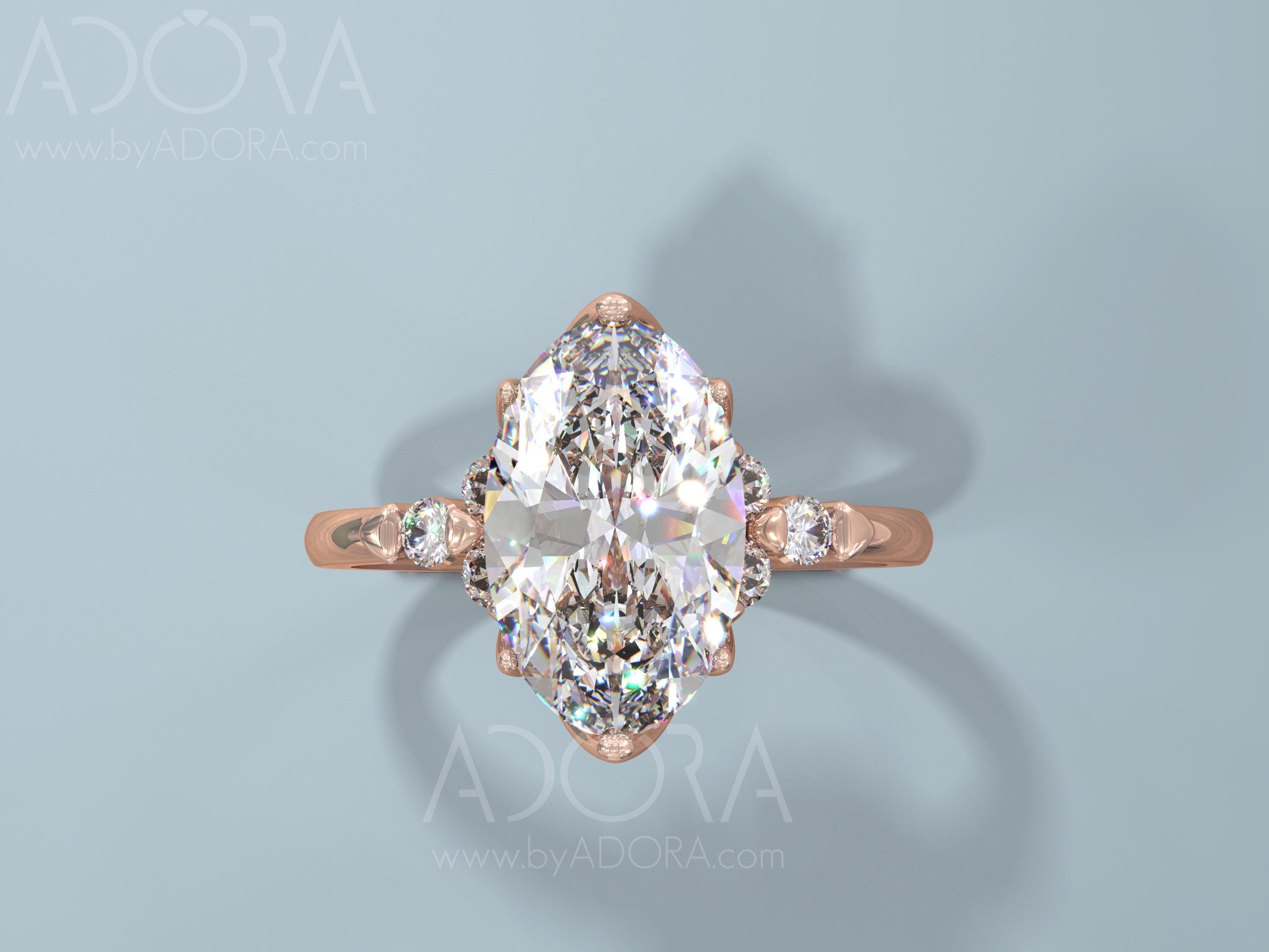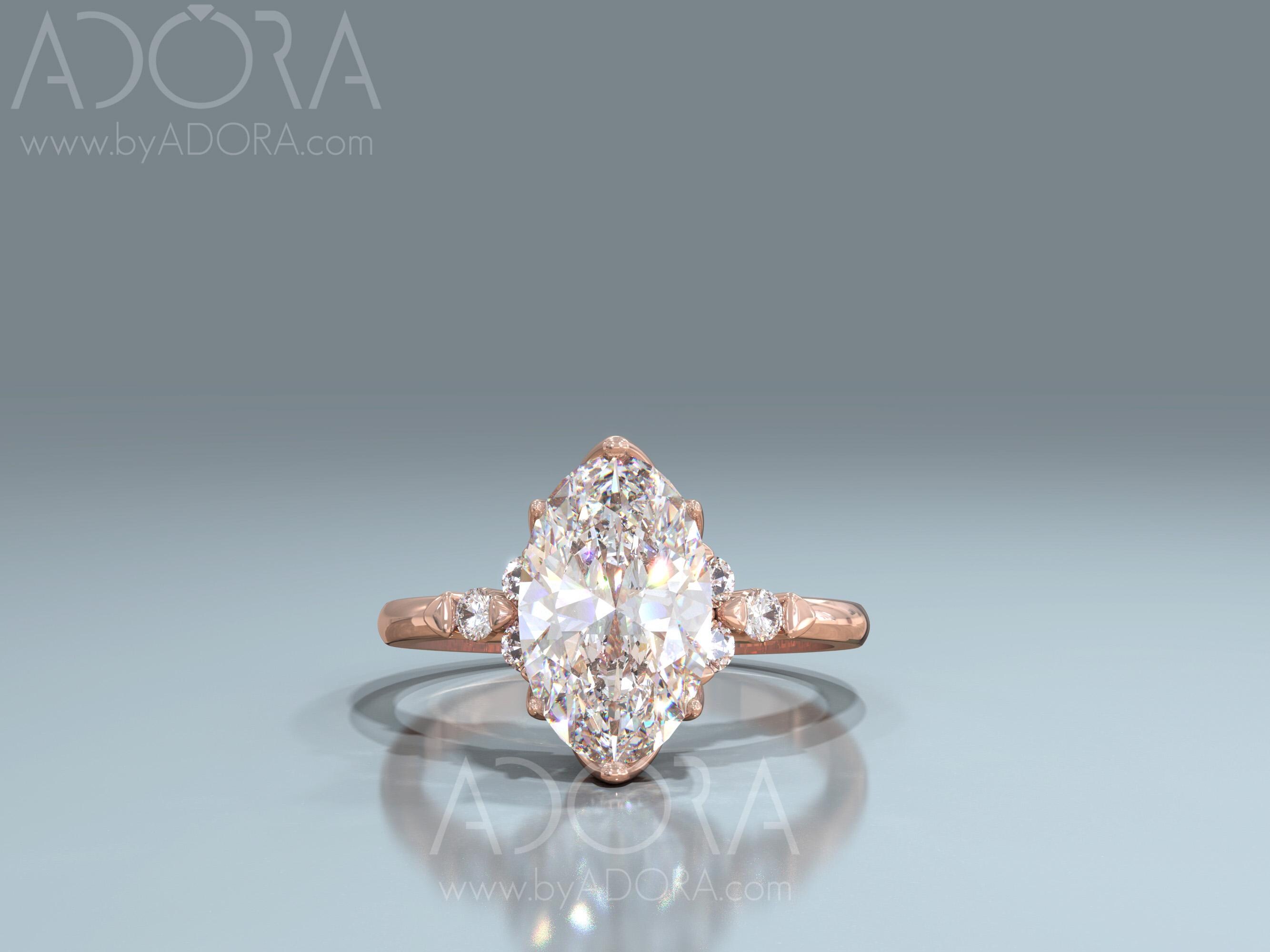 An elegant and remarkable Oval cut ring set with a lab grown diamond center stone and brilliant accent diamonds. The bezel was design as a flower petals to let more light intensify the natural beauty of the diamond, creating a ring no one can ignore. If you are looking for something exceptional, this ring is for you!