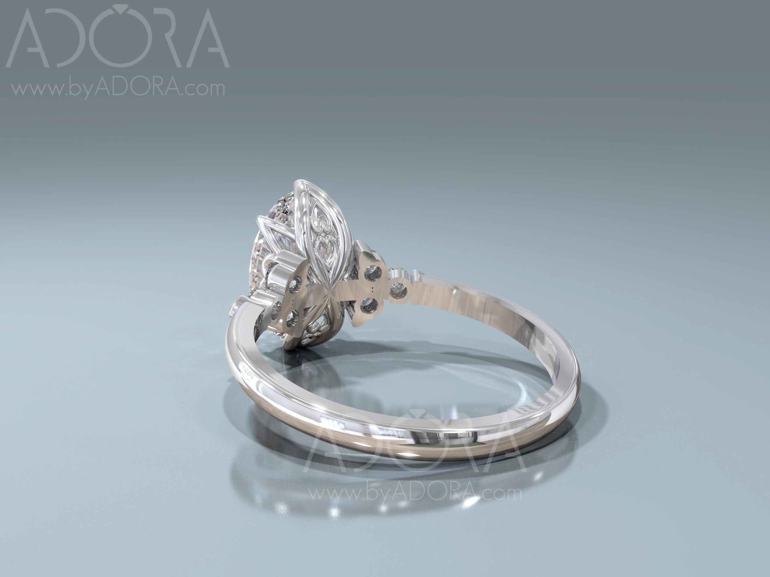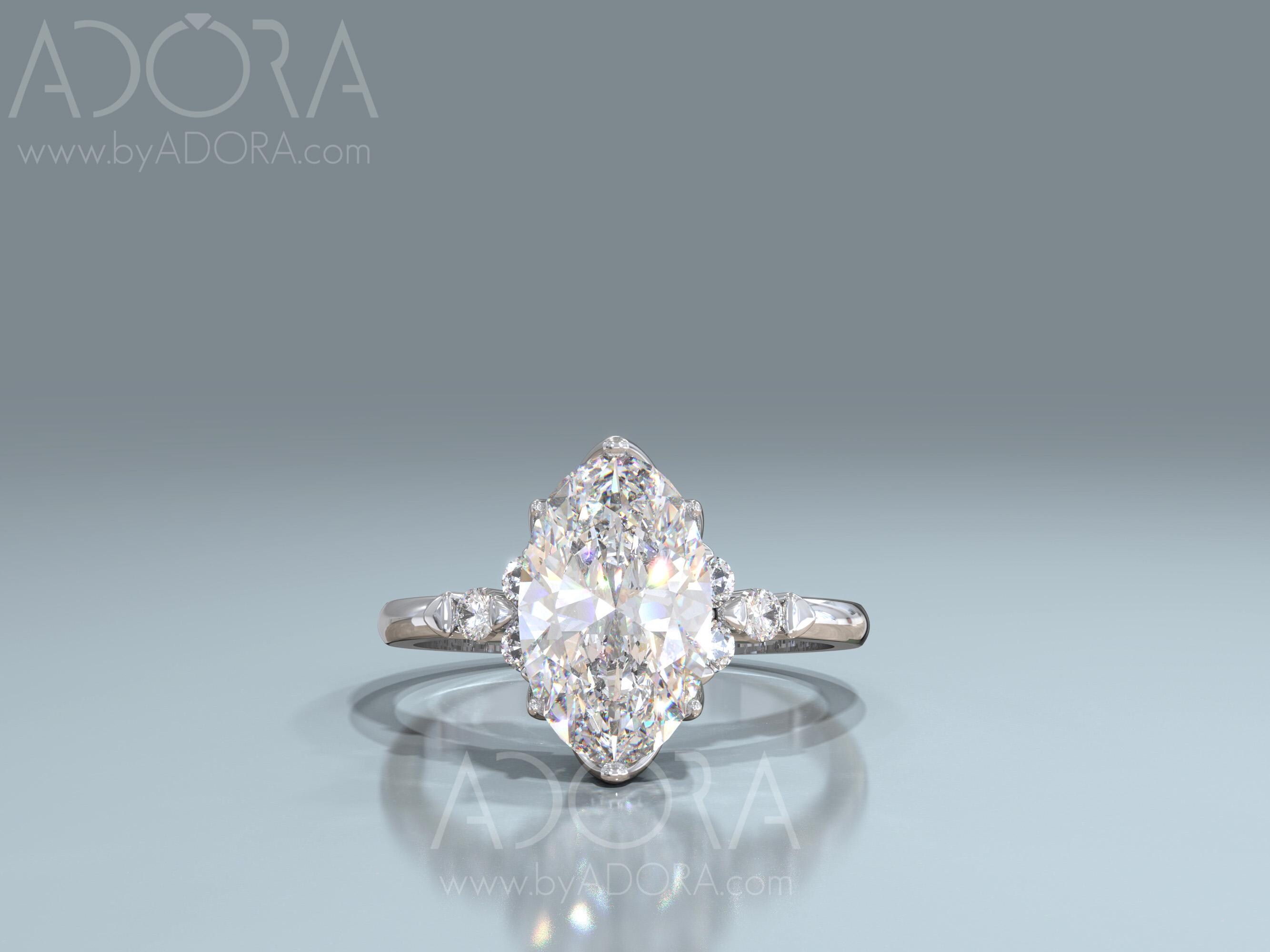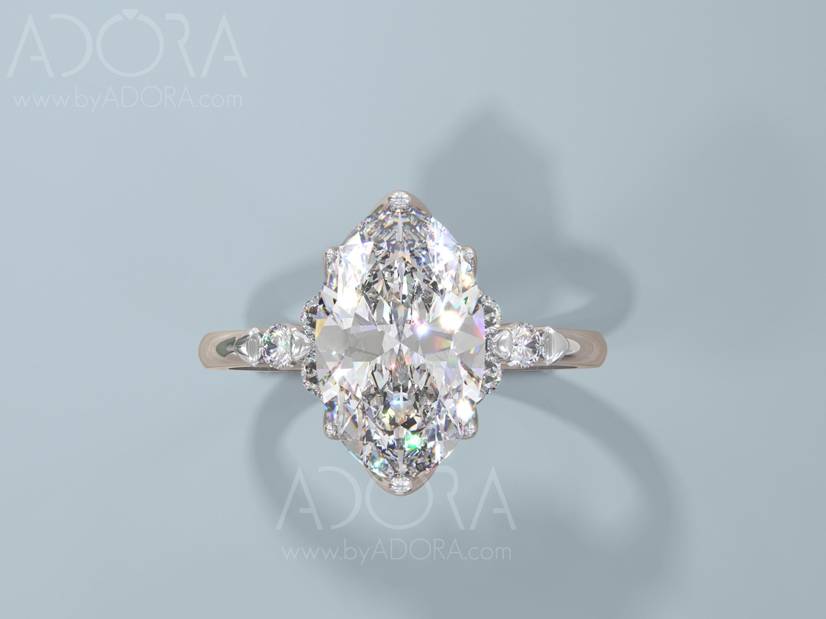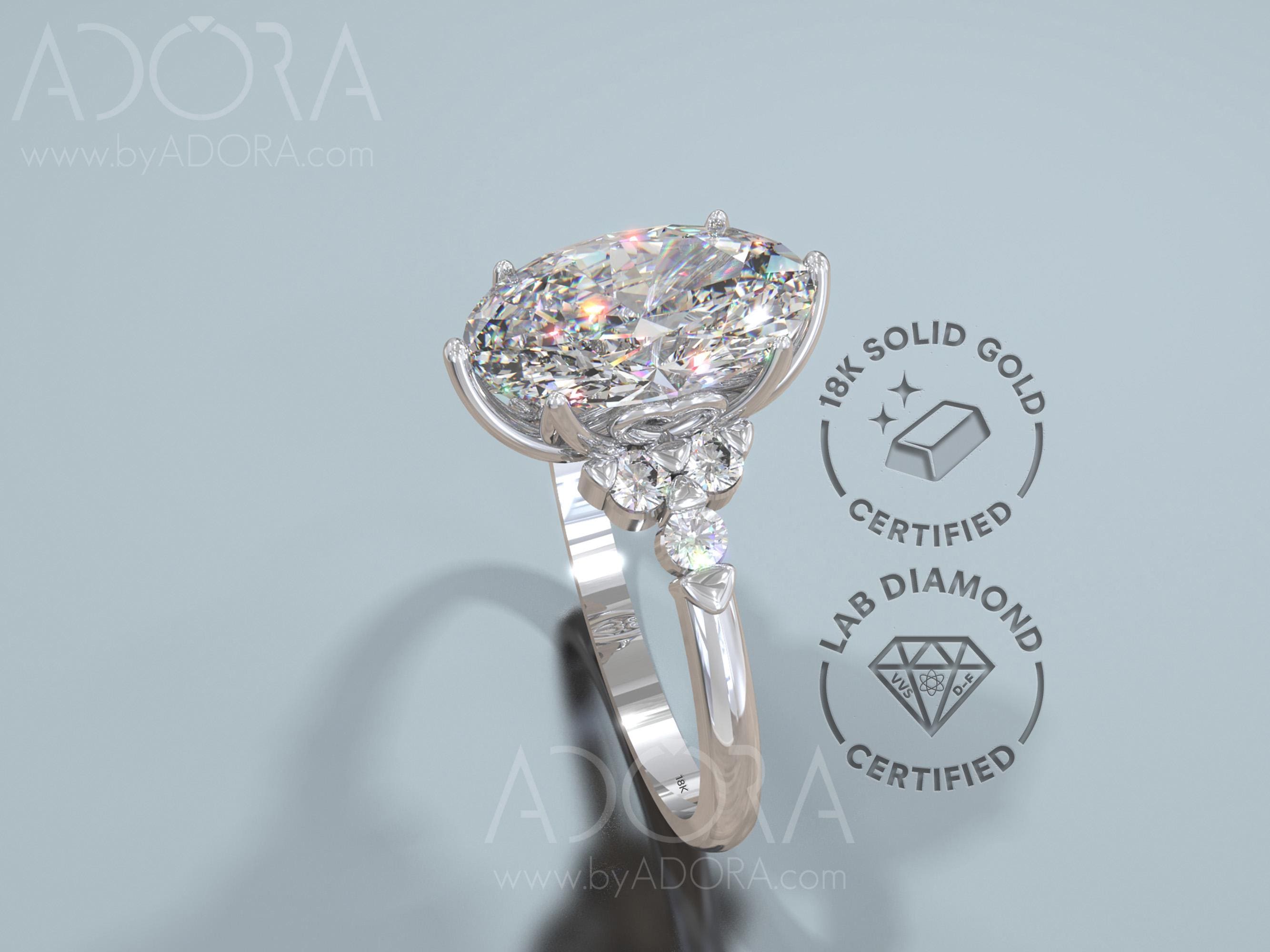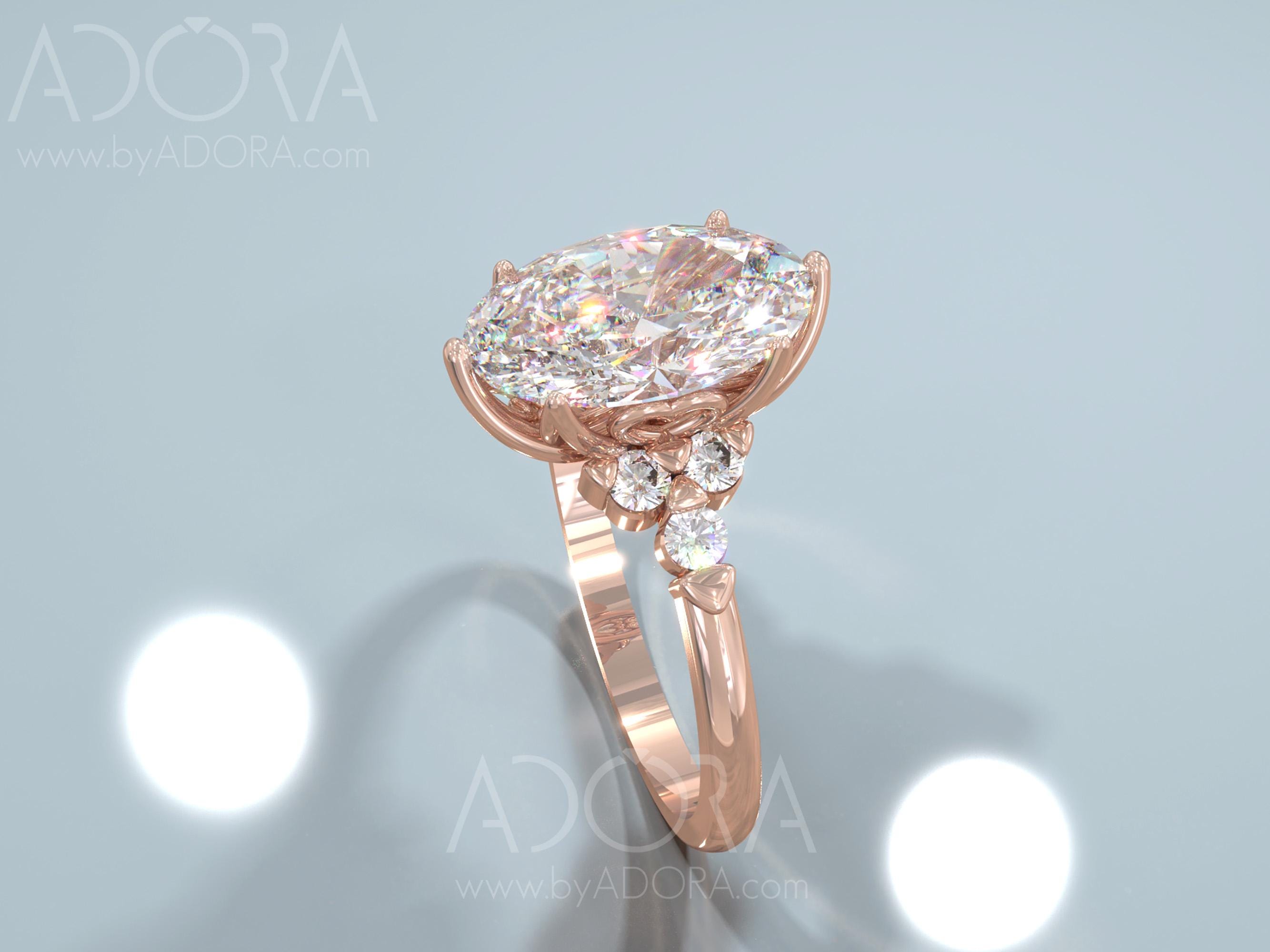 An elegant and remarkable Oval cut ring set with a lab grown diamond center stone and brilliant accent diamonds. The bezel was design as a flower petals to let more light intensify the natural beauty of the diamond, creating a ring no one can ignore. If you are looking for something exceptional, this ring is for you!