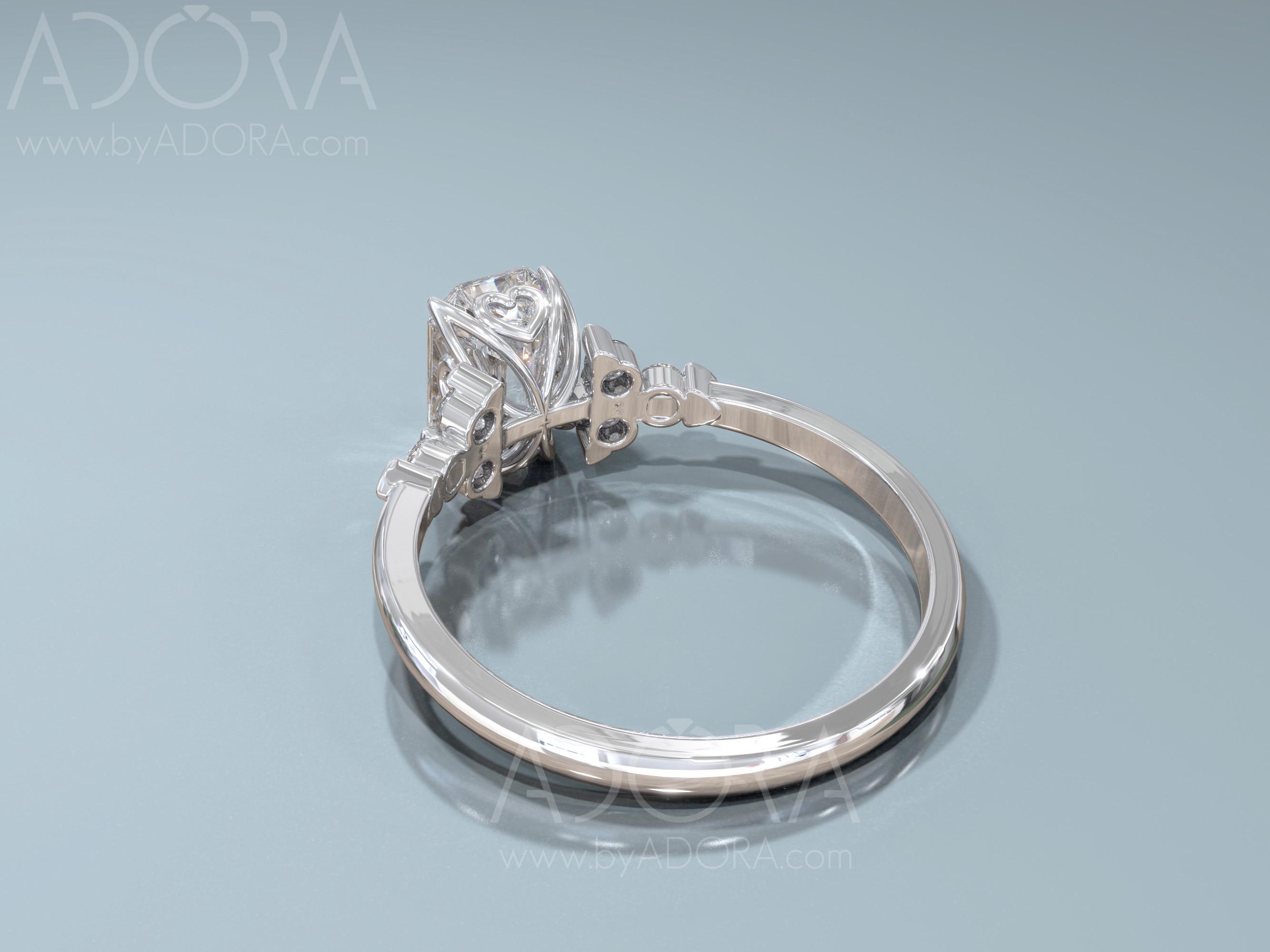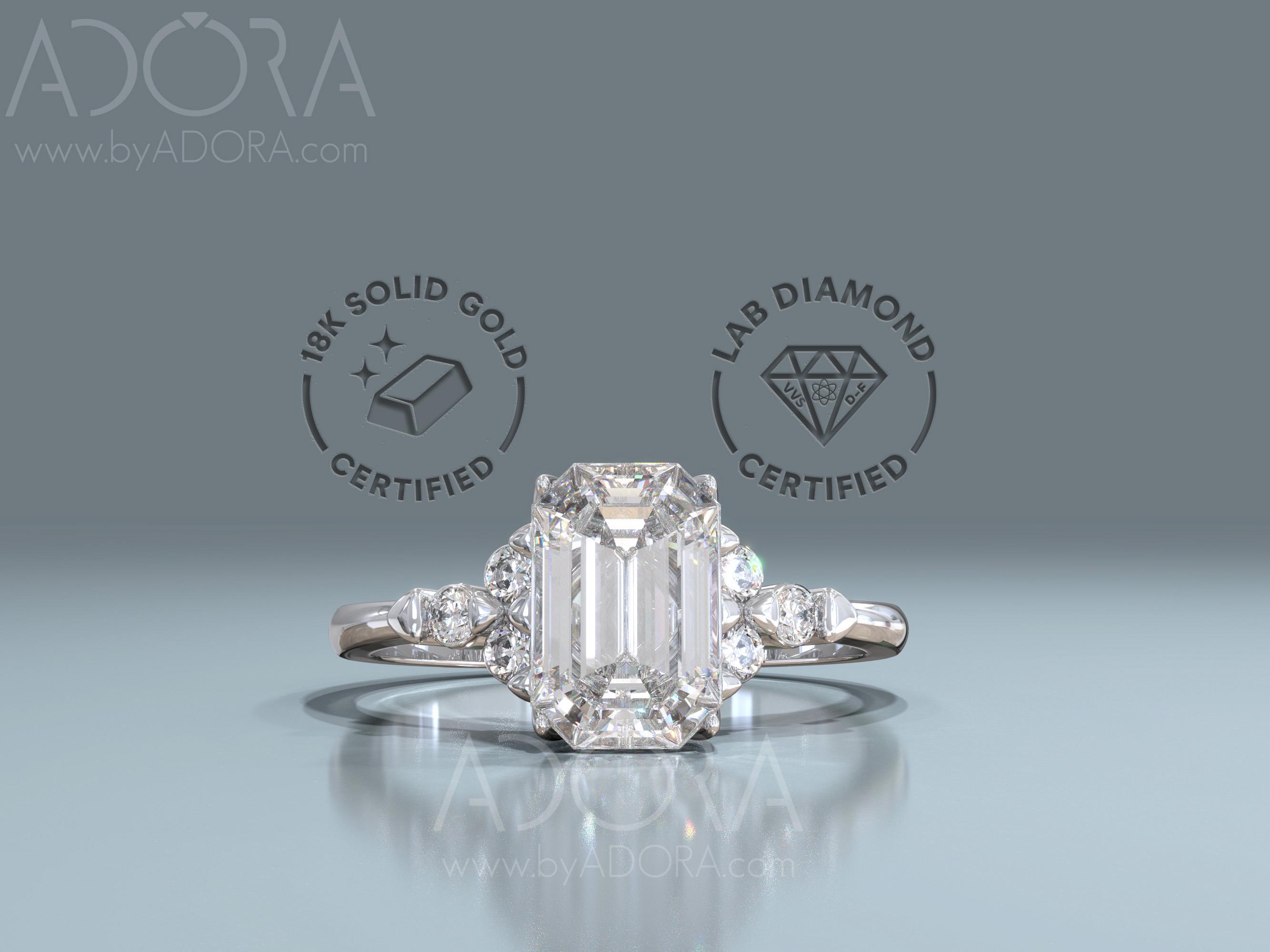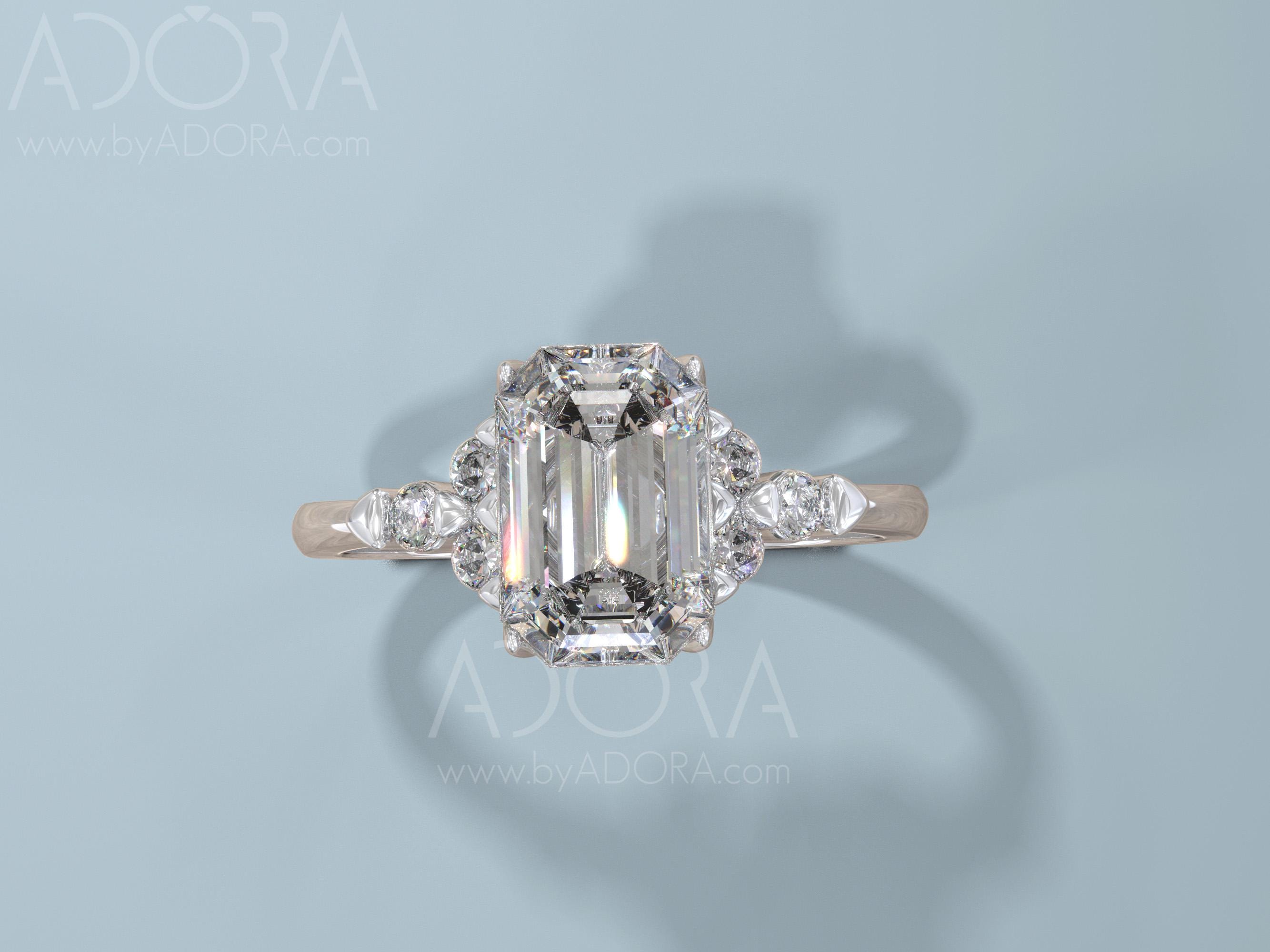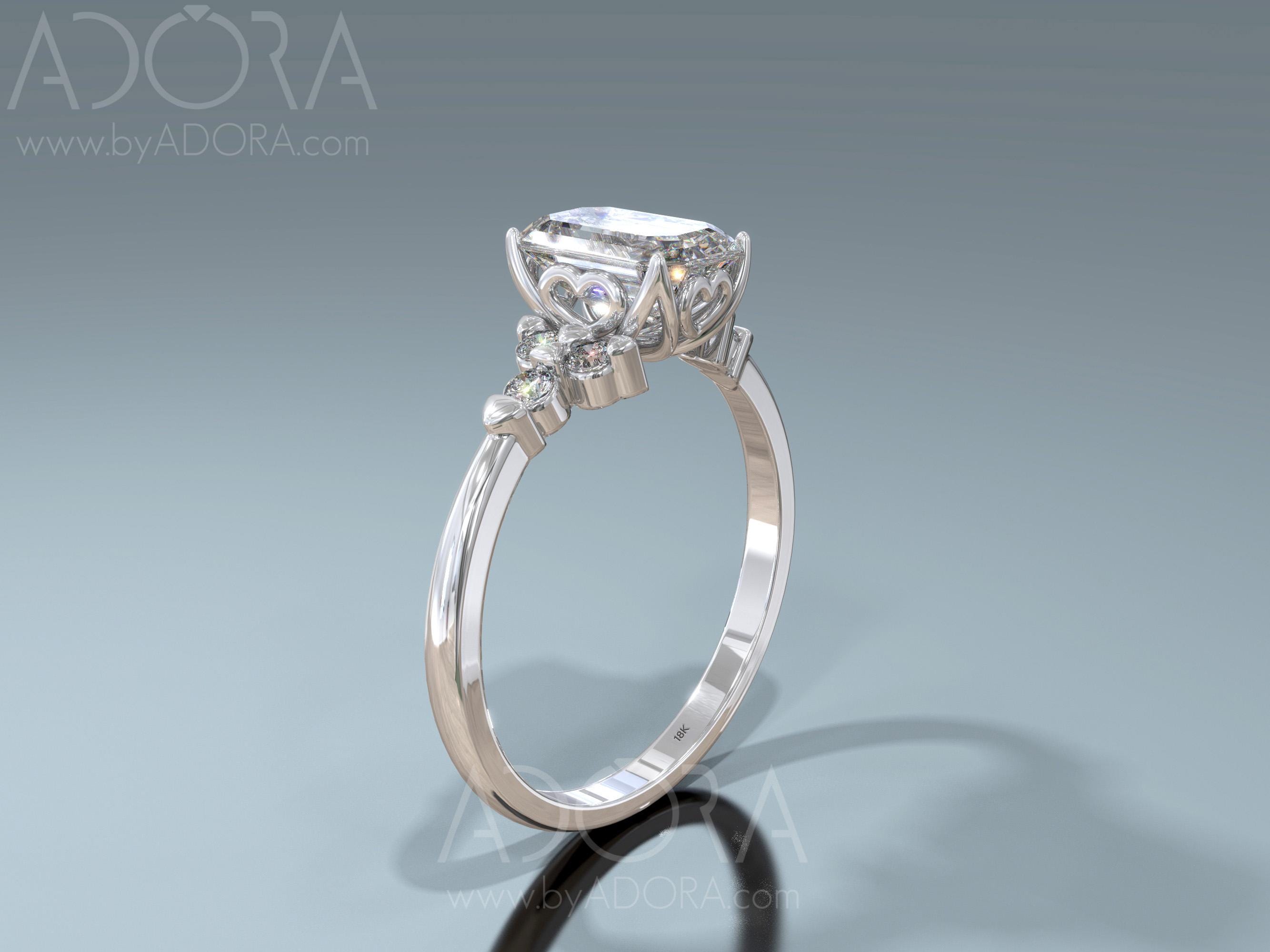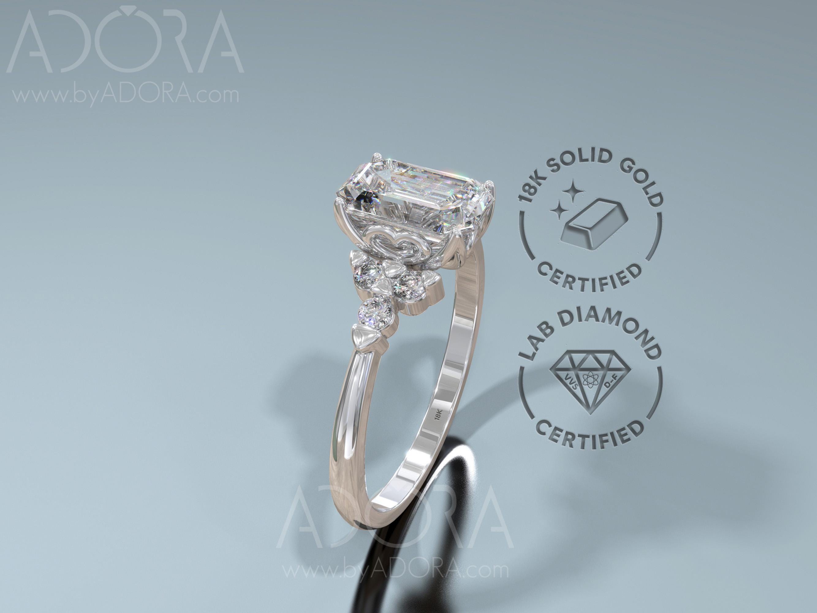 An elegant and remarkable Emerald cut ring set with a lab grown diamond center stone and brilliant accent diamonds. The bezel was design as a flower petals to let more light intensify the natural beauty of the diamond, creating a ring no one can ignore. If you are looking for something exceptional, this ring is for you!