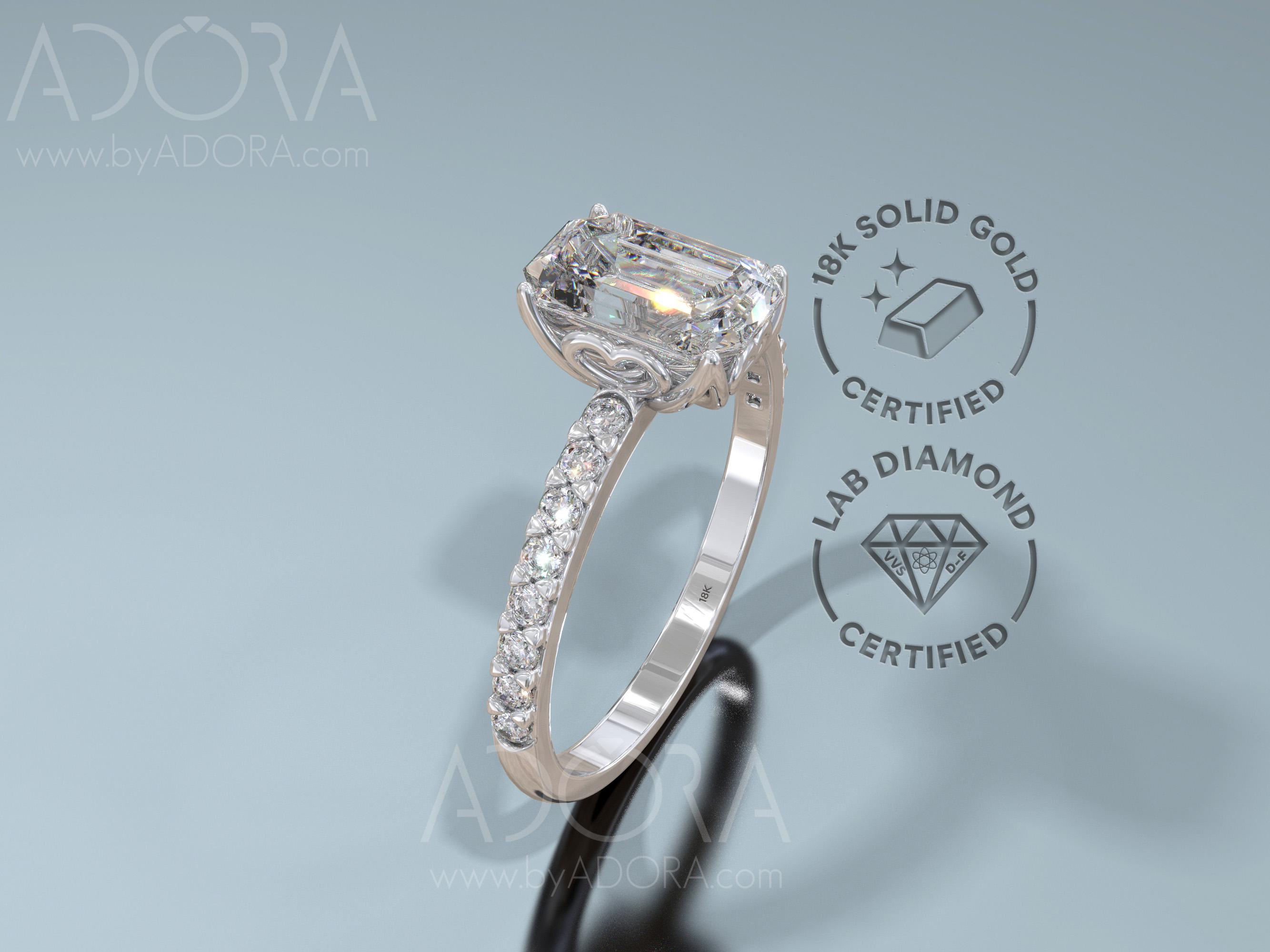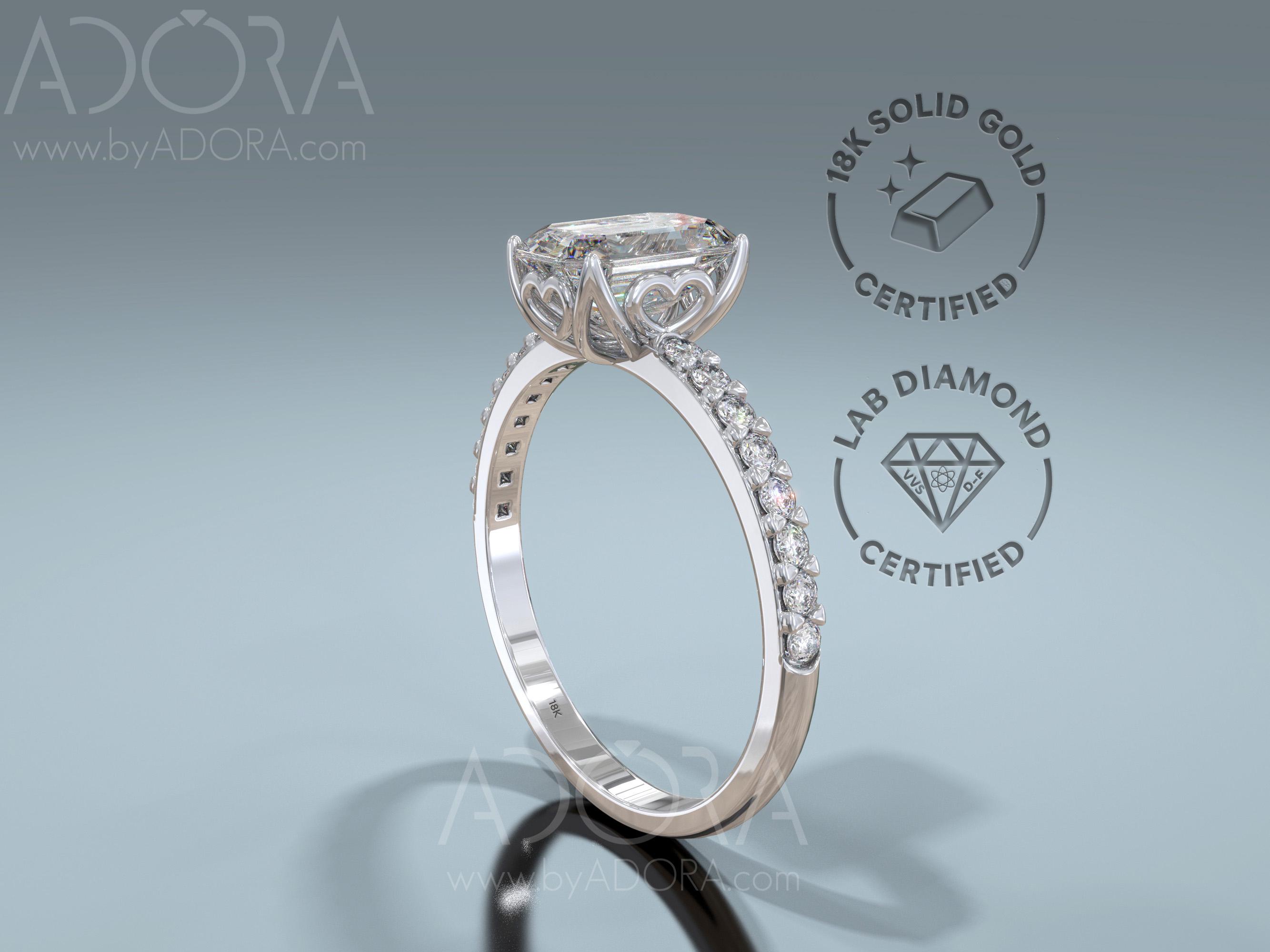 An elegant and romantic Emerald cut ring set with a lab grown diamond center stone and brilliant accent diamonds. The bezel was design as a flower petals to let more light intensify the natural beauty of the diamond, creating a ring no one can ignore. If you are looking for something exceptional, this ring is for you!