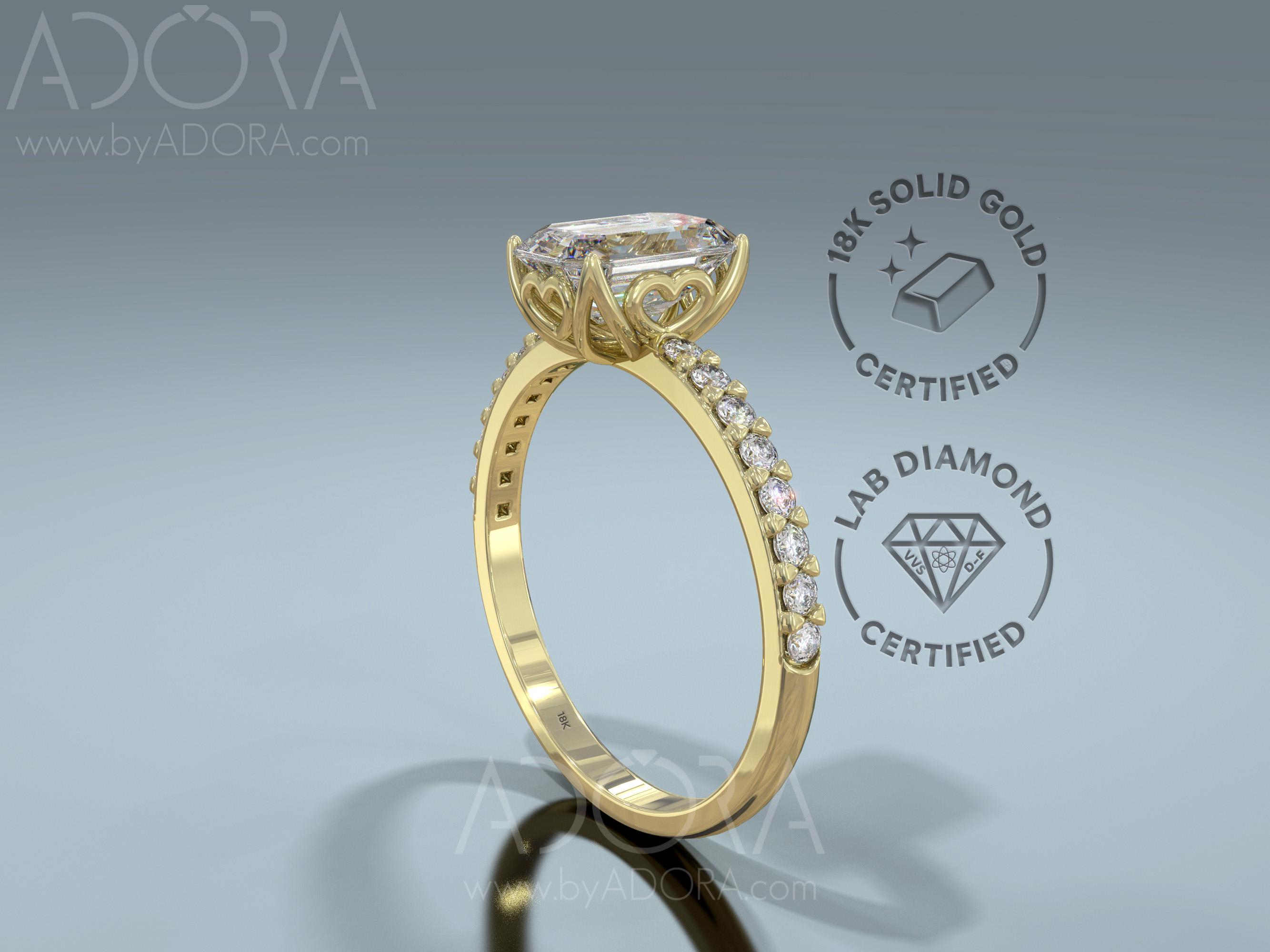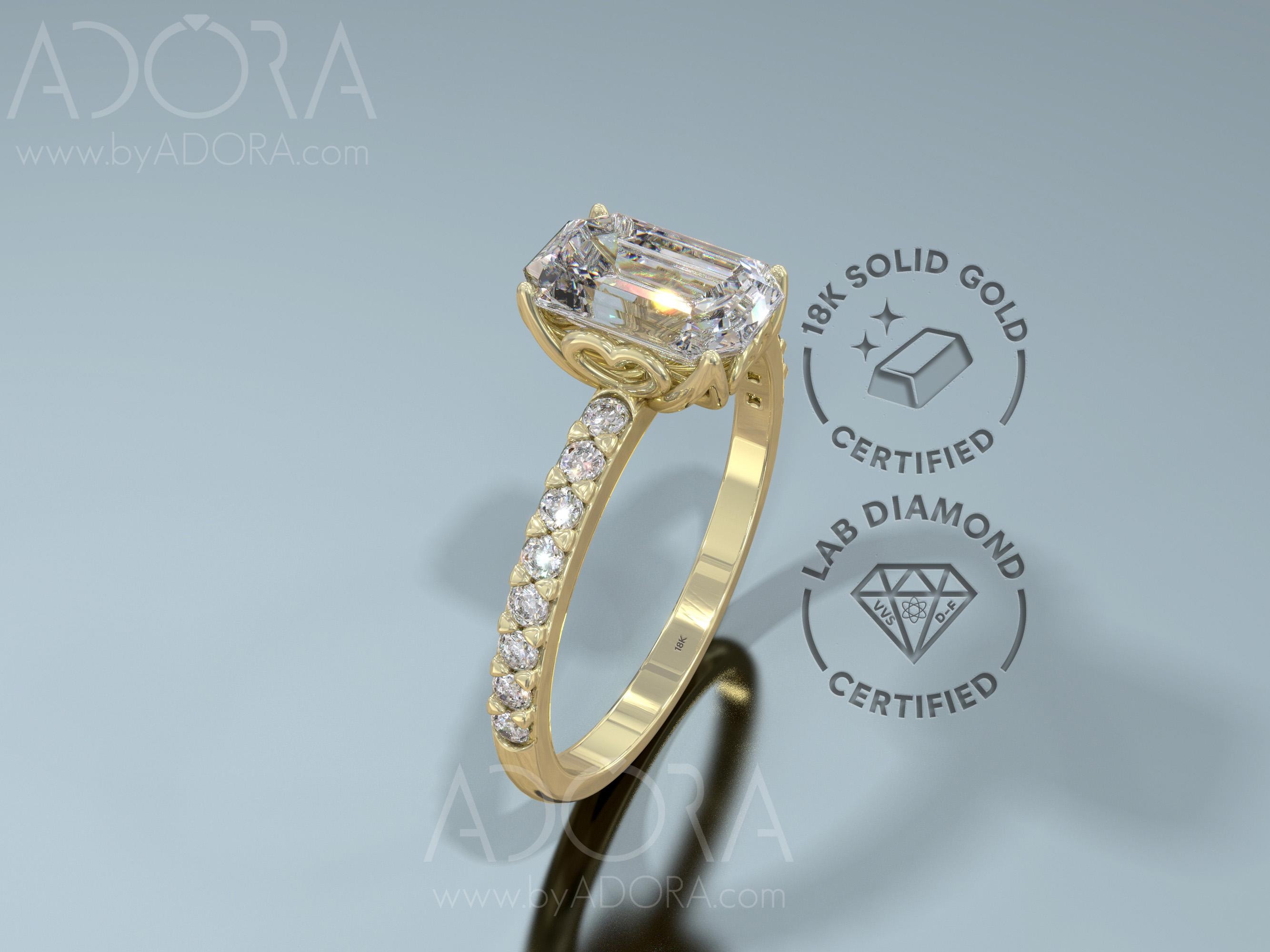 An elegant and romantic Emerald cut ring set with a lab grown diamond center stone and brilliant accent diamonds. The bezel was design as a flower petals to let more light intensify the natural beauty of the diamond, creating a ring no one can ignore. If you are looking for something exceptional, this ring is for you!