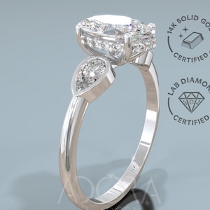 An elegant and romantic Oval cut ring set with a lab grown diamond center stone and brilliant accent diamonds. The bezel was design as a hidden Halo to add more sparkle the natural beauty of the diamond, creating a ring no one can ignore. If you are looking for something exceptional, this ring is for you!