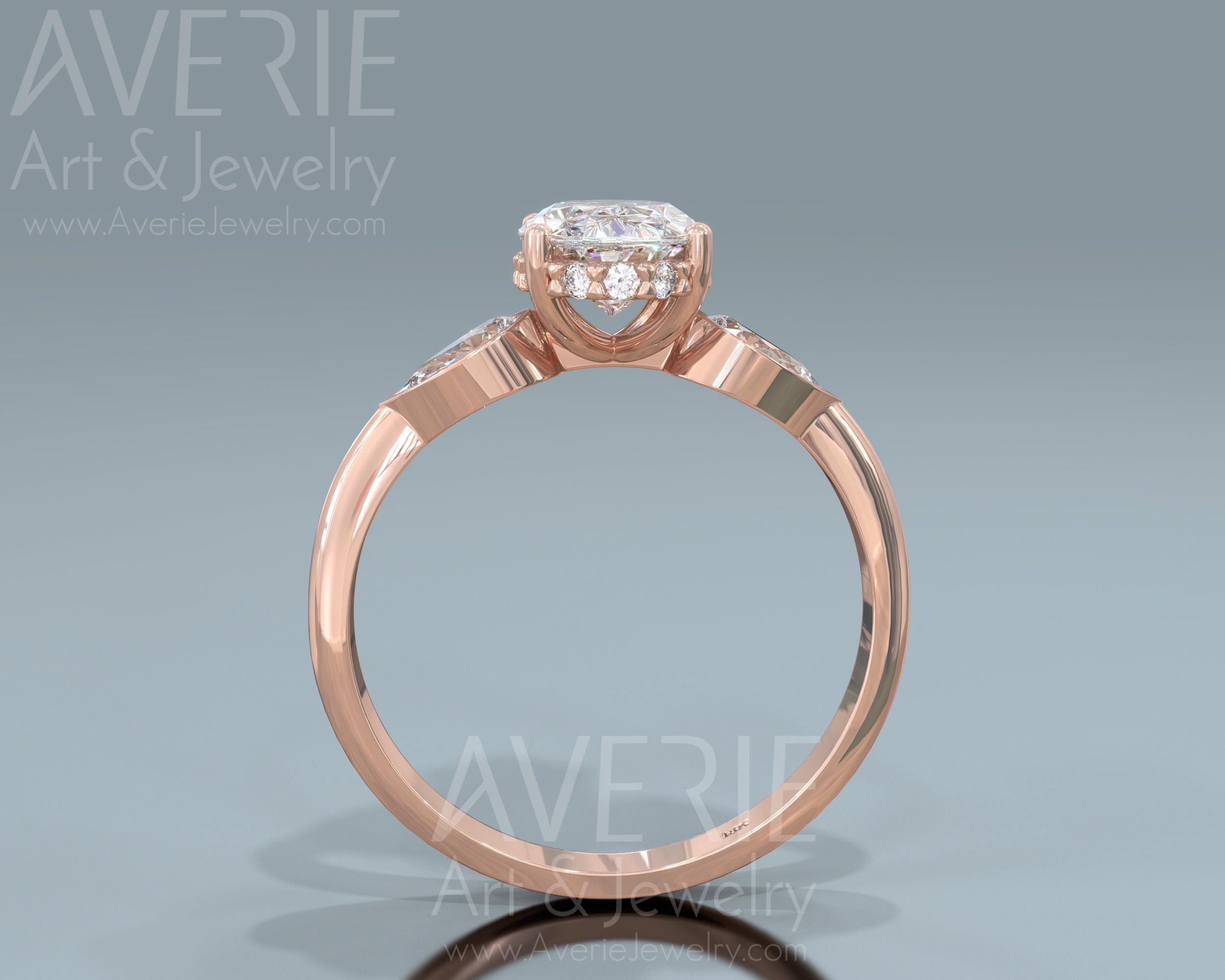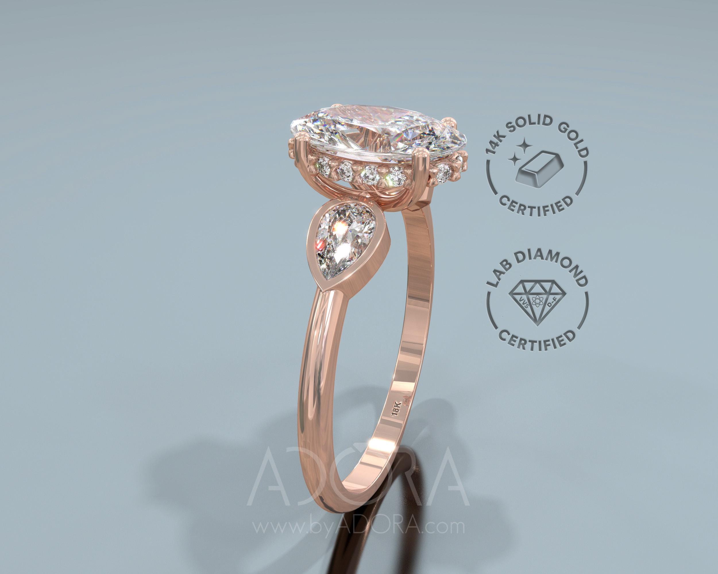 14K Hidden Halo Oval Cut Diamond Three Stone Engagement Ring. 14k rose gold 3 stones engagement ring set with Oval cut lab diamond.
