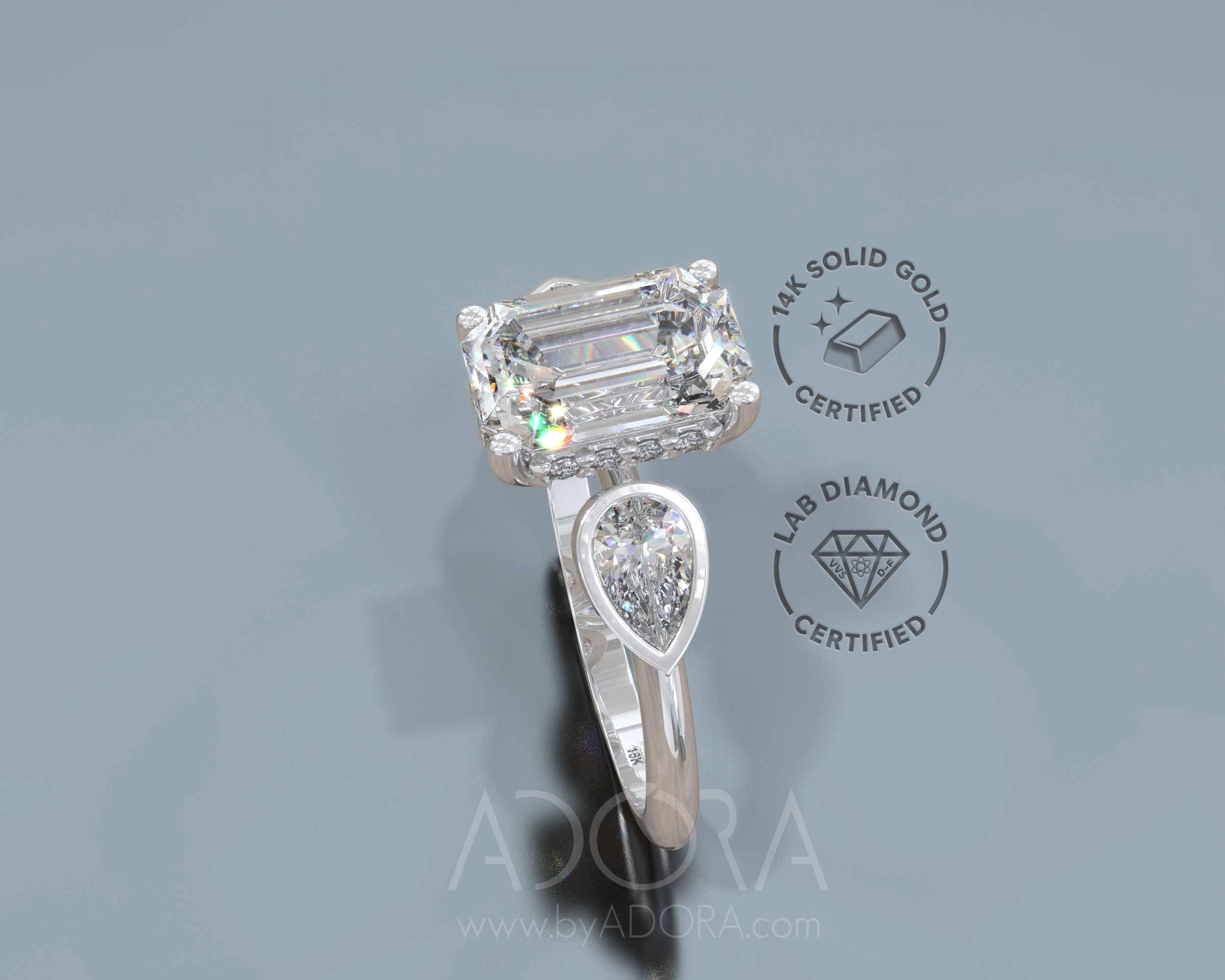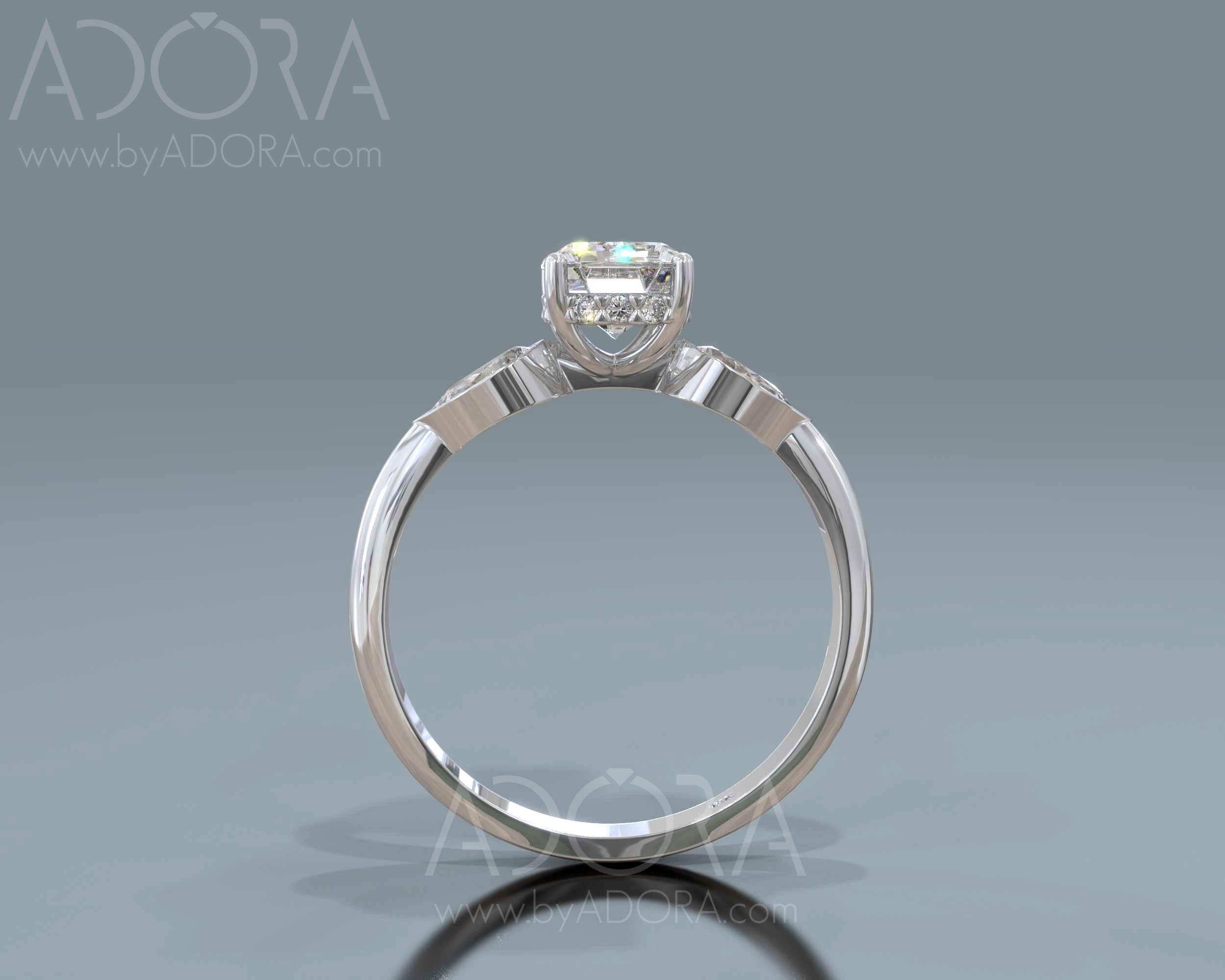 An elegant and romantic Emerald cut ring set with a lab grown diamond center stone and brilliant accent diamonds. The bezel was design as a hidden Halo to add more sparkle the natural beauty of the diamond, creating a ring no one can ignore. If you are looking for something exceptional, this ring is for you!