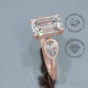 An elegant and romantic Emerald cut ring set with a lab grown diamond center stone and brilliant accent diamonds. The bezel was design as a flower petals to let more light intensify the natural beauty of the diamond, creating a ring no one can ignore. If you are looking for something exceptional, this ring is for you!