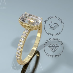 An elegant and romantic Emerald cut ring set with a lab grown diamond center stone and brilliant accent diamonds. The bezel was design as a flower petals to let more light intensify the natural beauty of the diamond, creating a ring no one can ignore. If you are looking for something exceptional, this ring is for you!