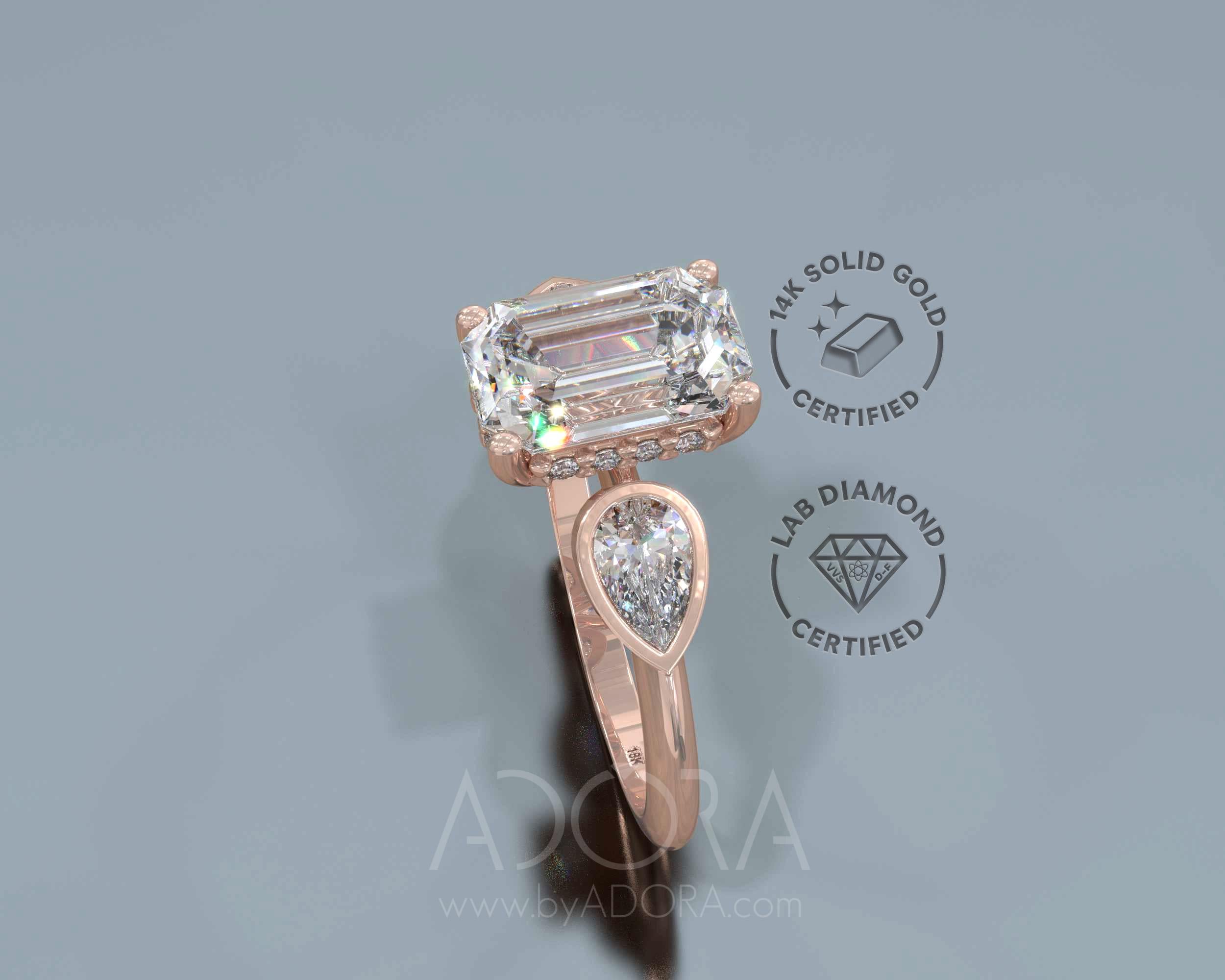 14K Hidden Halo Emerald Cut Diamond Three Stone Engagement Ring. 14k rose gold 3 stones engagement ring set with Emerald cut lab diamond.