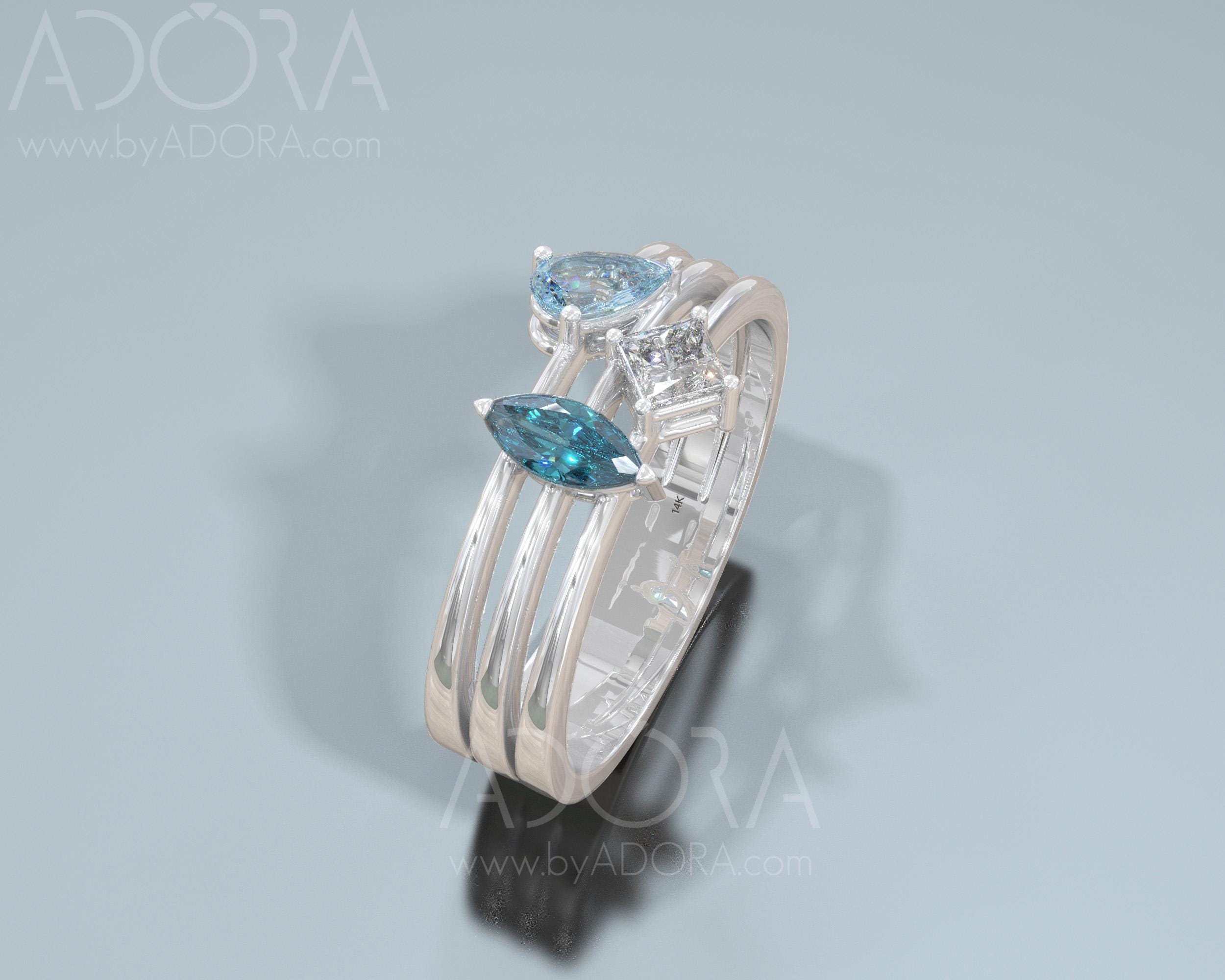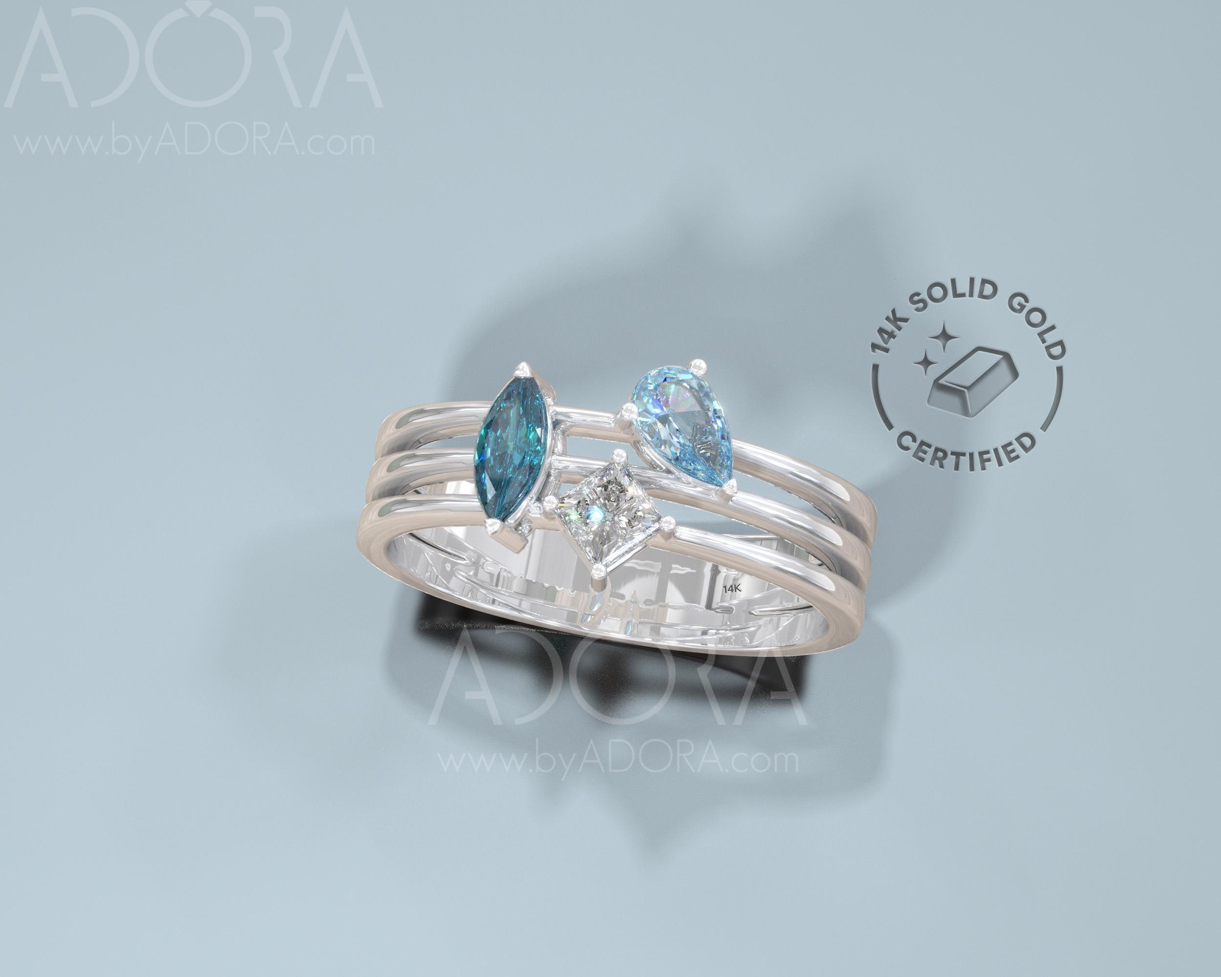 Handmade 14K White Gold Three Stone Cluster Ring | Princess Diamond, Pear Aquamarine, and Marquise London Blue Topaz cluster ring