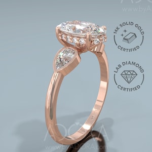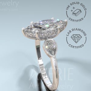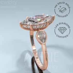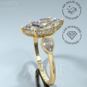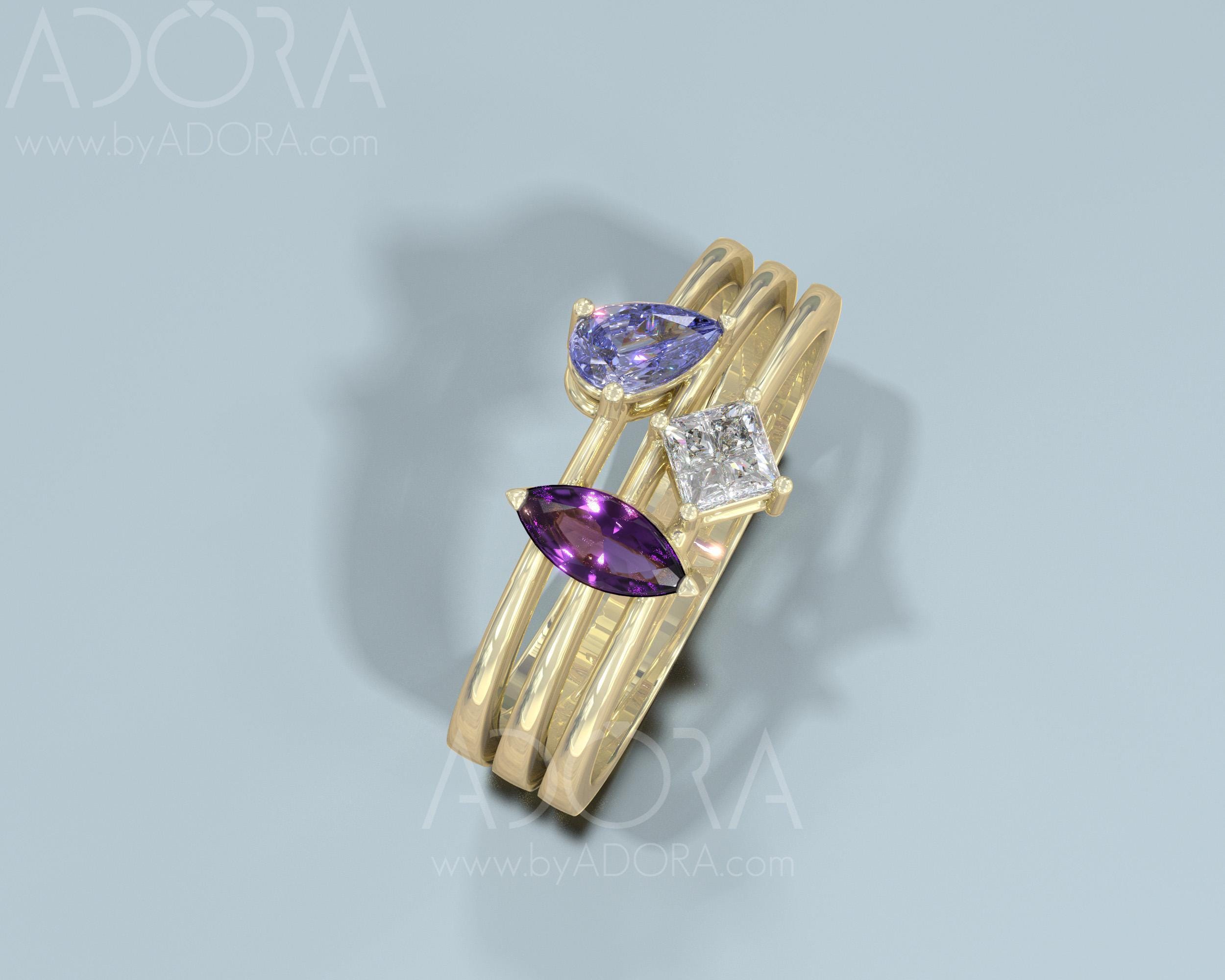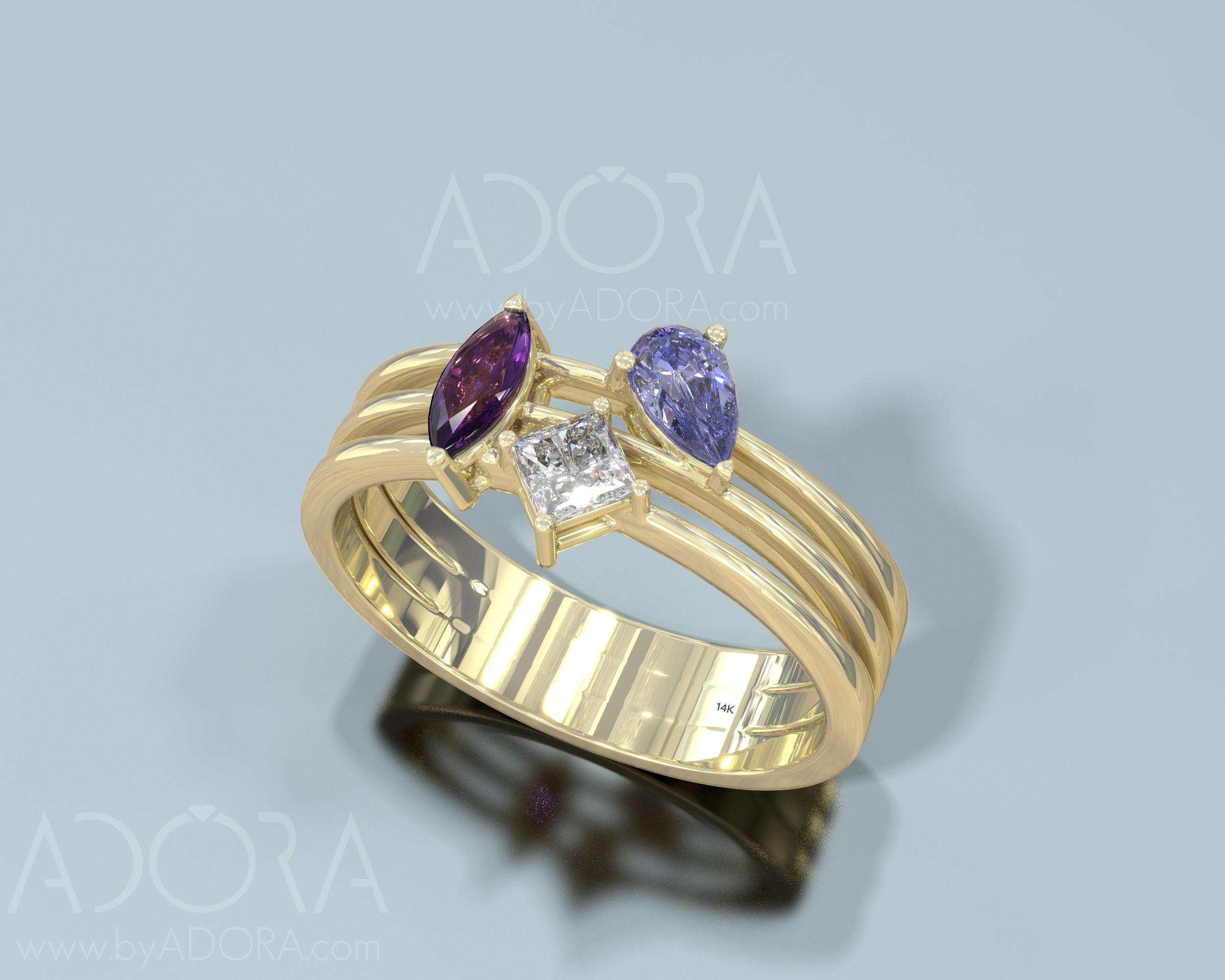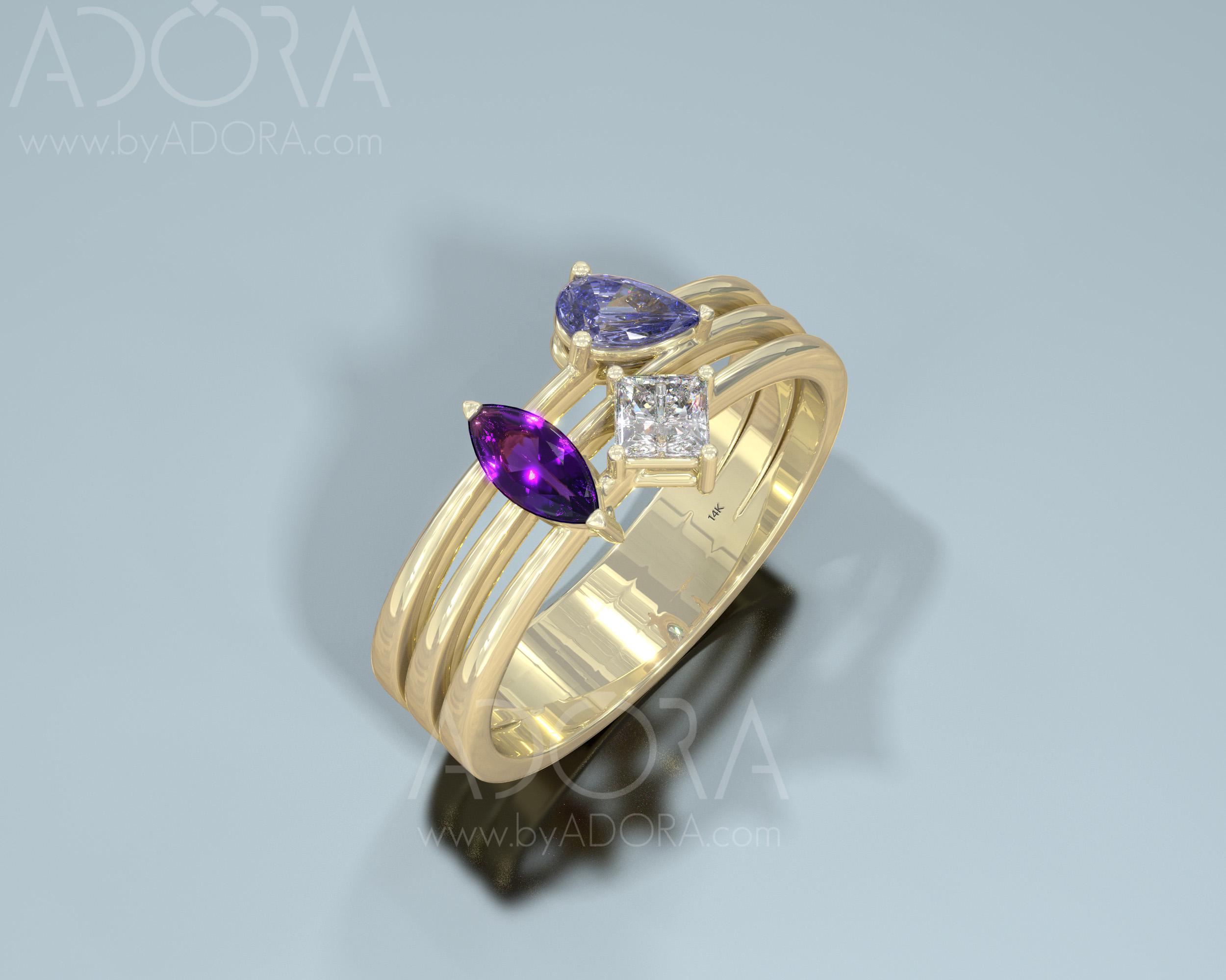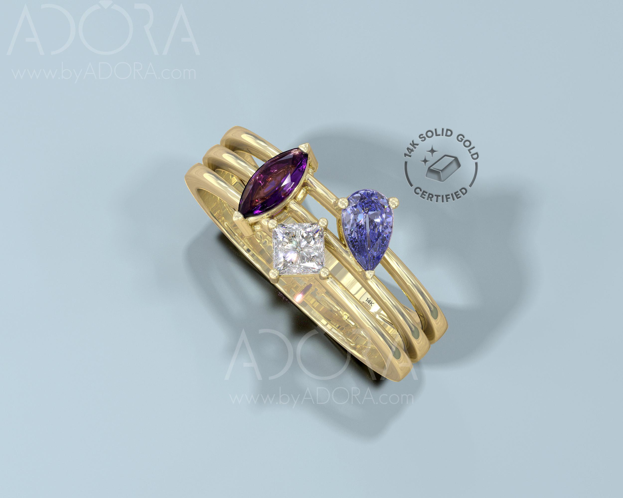 Handmade 14K Gold Three Stone Cluster Ring | Princess Diamond, Pear Tanzanite, and Marquise Amethyst cluster ring