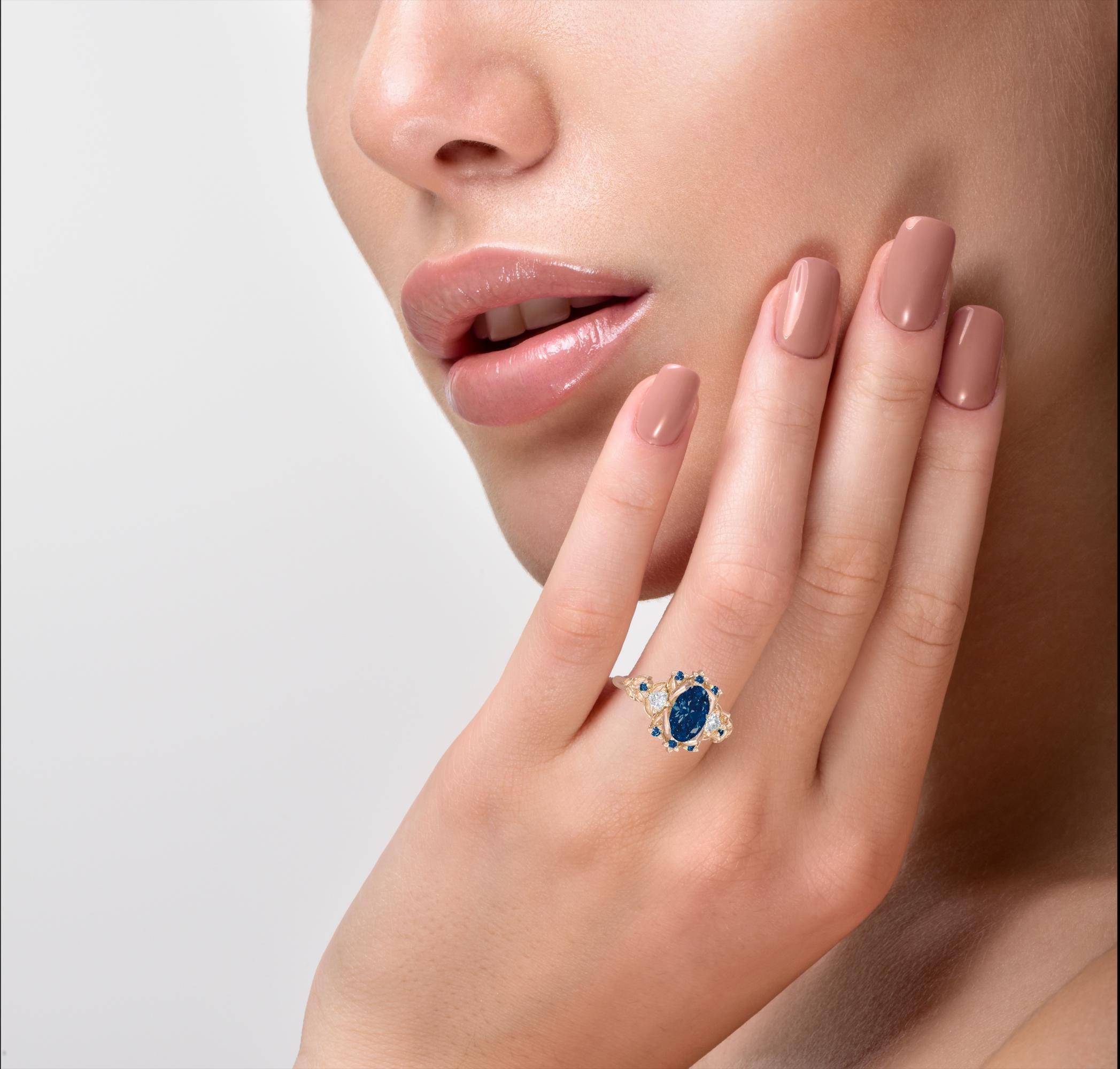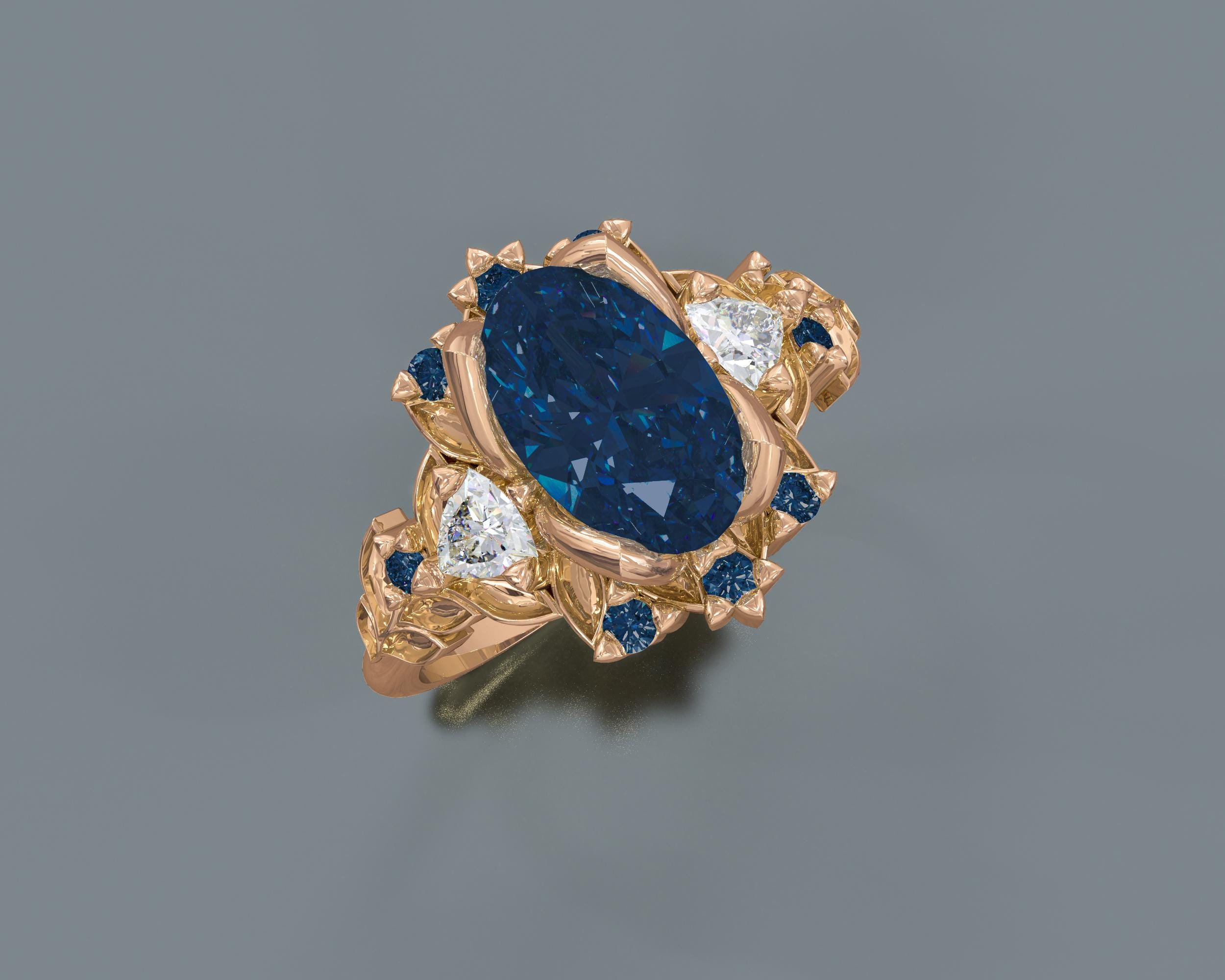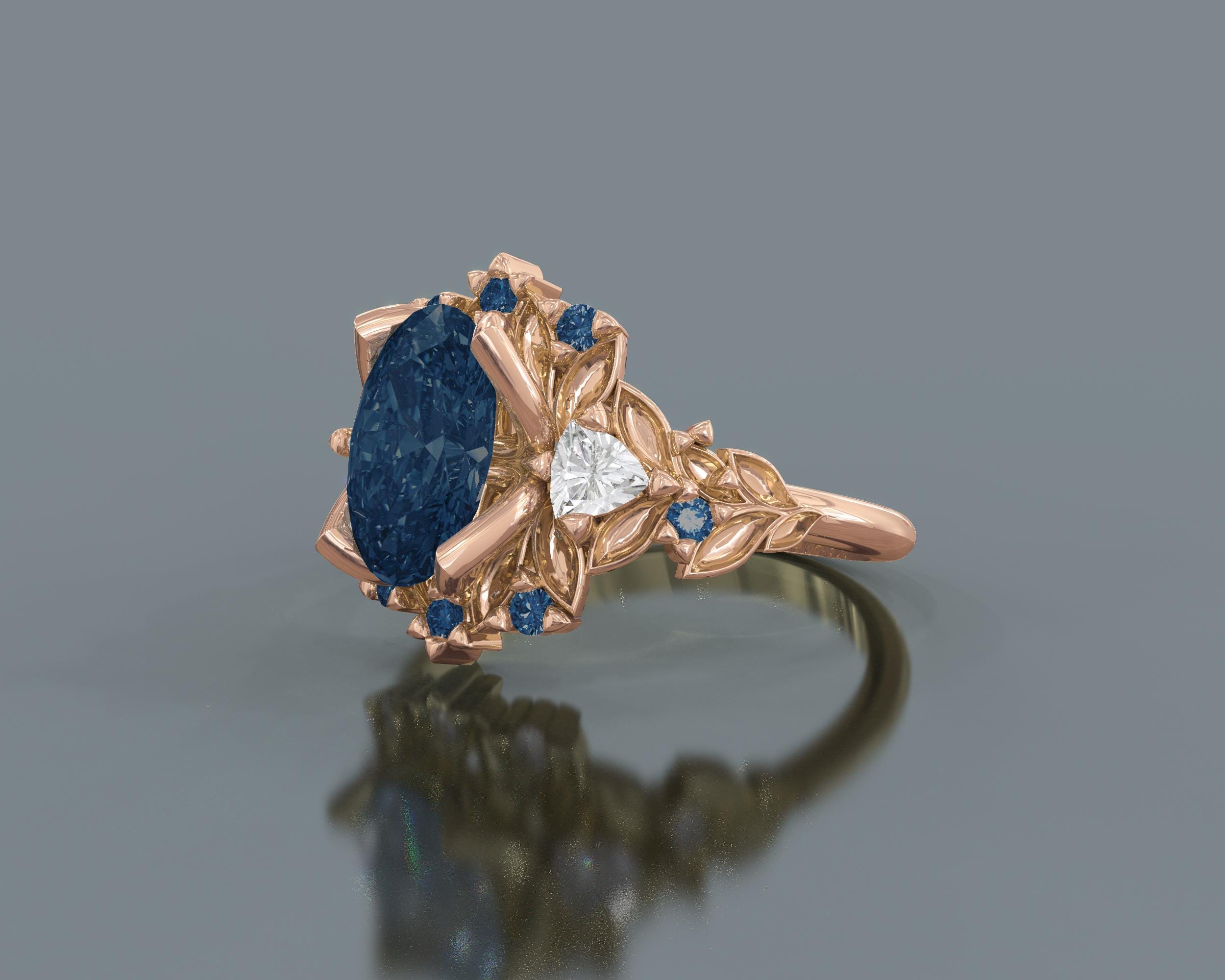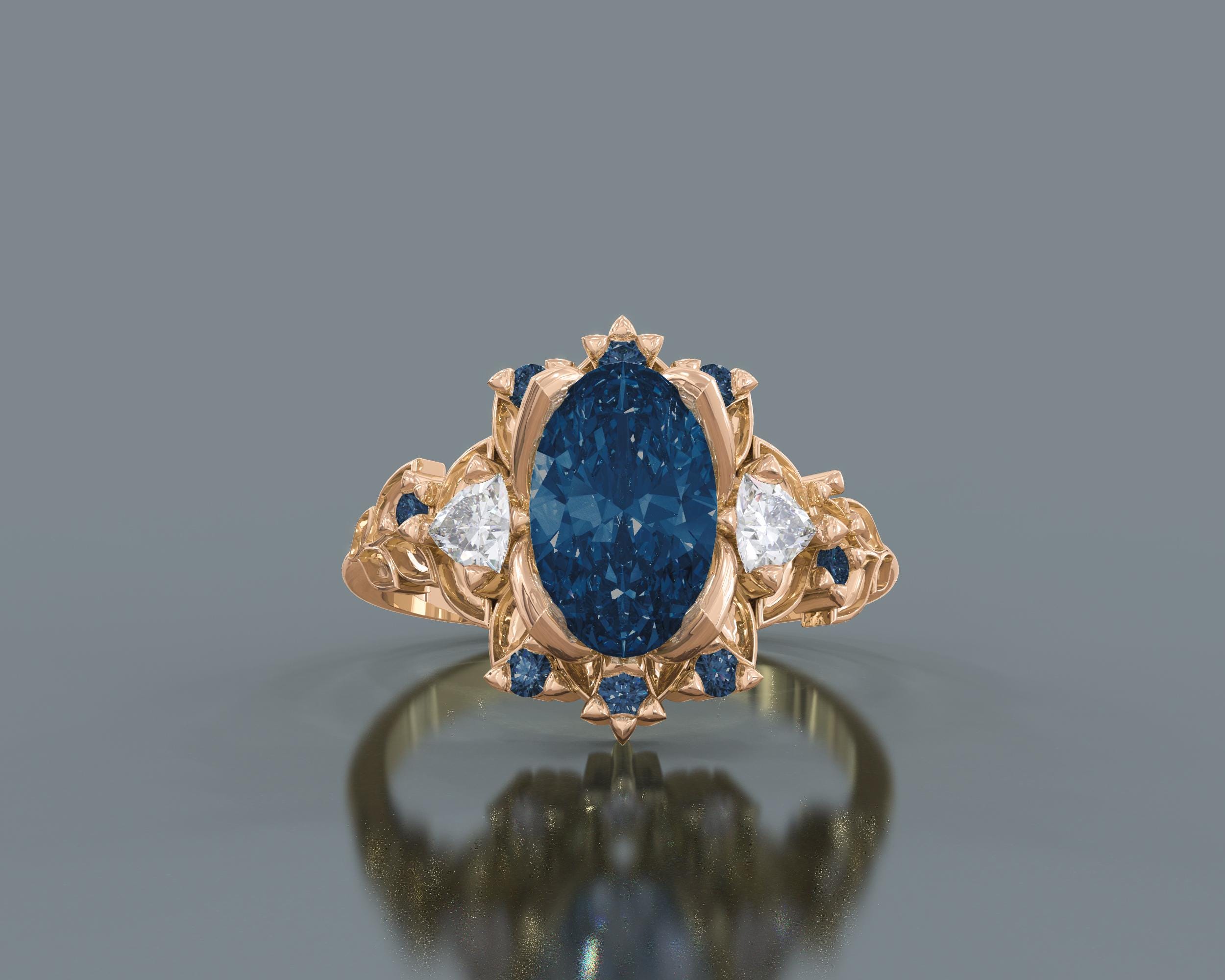 A breathtaking Briar Rose Three Stone Blue Sapphire Engagement Ring. Presenting an oval cut blue sapphire center stone and accompanied Trillion cut diamond from each side. Additional tiny blue sapphires are scattered all around to make the ring sparkle at every angle. The blue sapphire flower ring can be made from 10K, 14K or 18K Solid Gold.